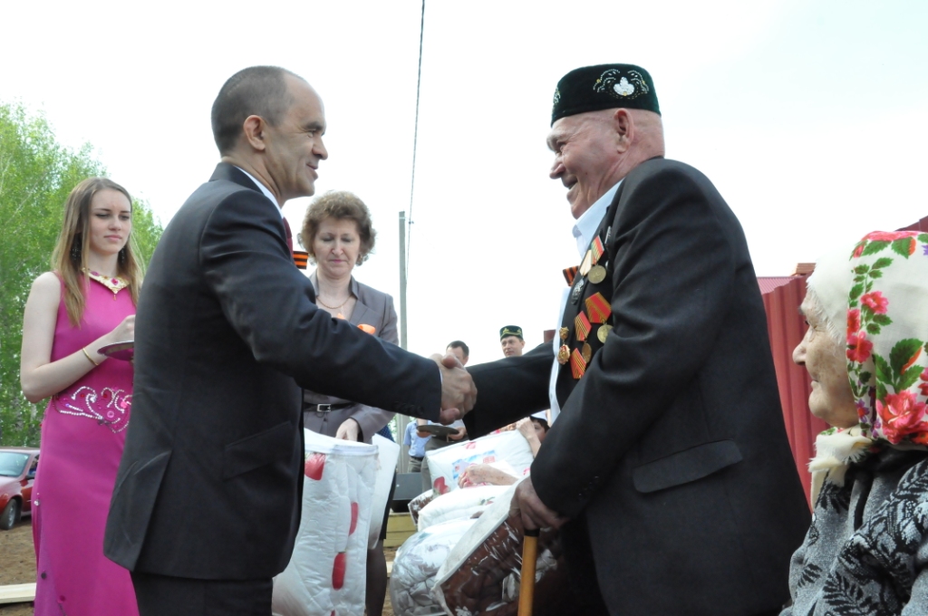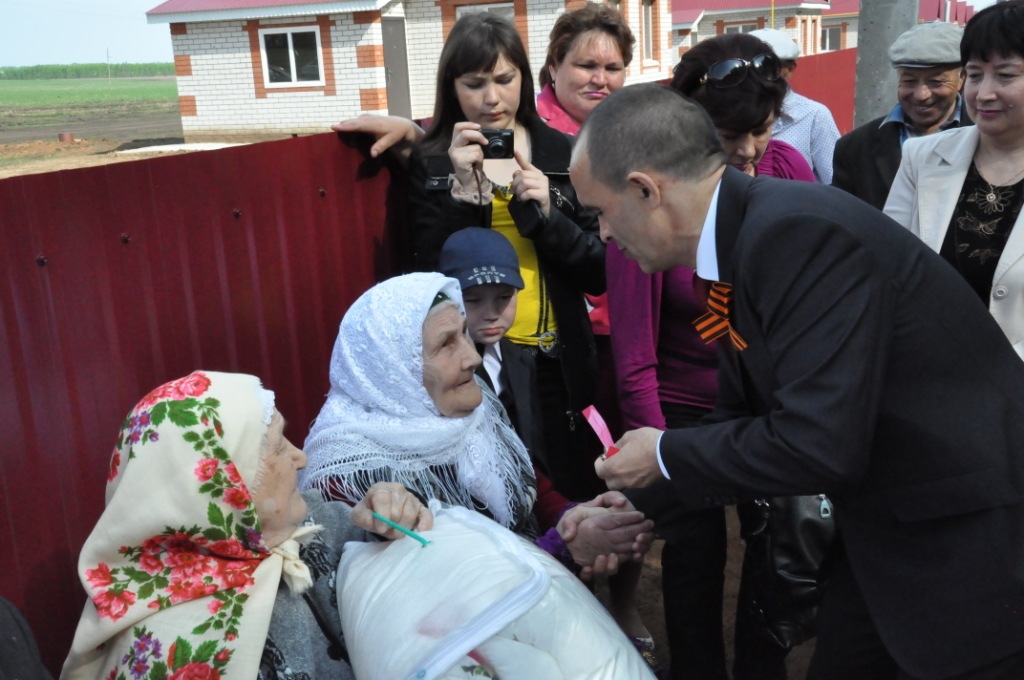 Бөек Ватан сугышы ветераннары, аларның тол калган хатыннарының торак хәлләрен яхшырту максатыннан эшләп килүче федераль программа нигезендә, районыбызда барысы 400 ветеран исемлеккә кертелгән. Аларның инде 336 сы яңа тораклы – йортлы булды. Әлеге йортларның соңгы 11енең ачкычларын бүген – нәкъ менә Җиңү бәйрәме көнне район башлыгы Э.Н.Фәттахов тантаналы рәвештә ияләренә тапшырды.