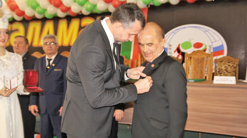 Поздравив с открытием турнира, Равиль Уелович выразив слова благодарности, вручил главе Актанышского района Энгелю Наваповичу Фаттахову медаль Федерации корэш России "За заслуги в развитии борьбы России".