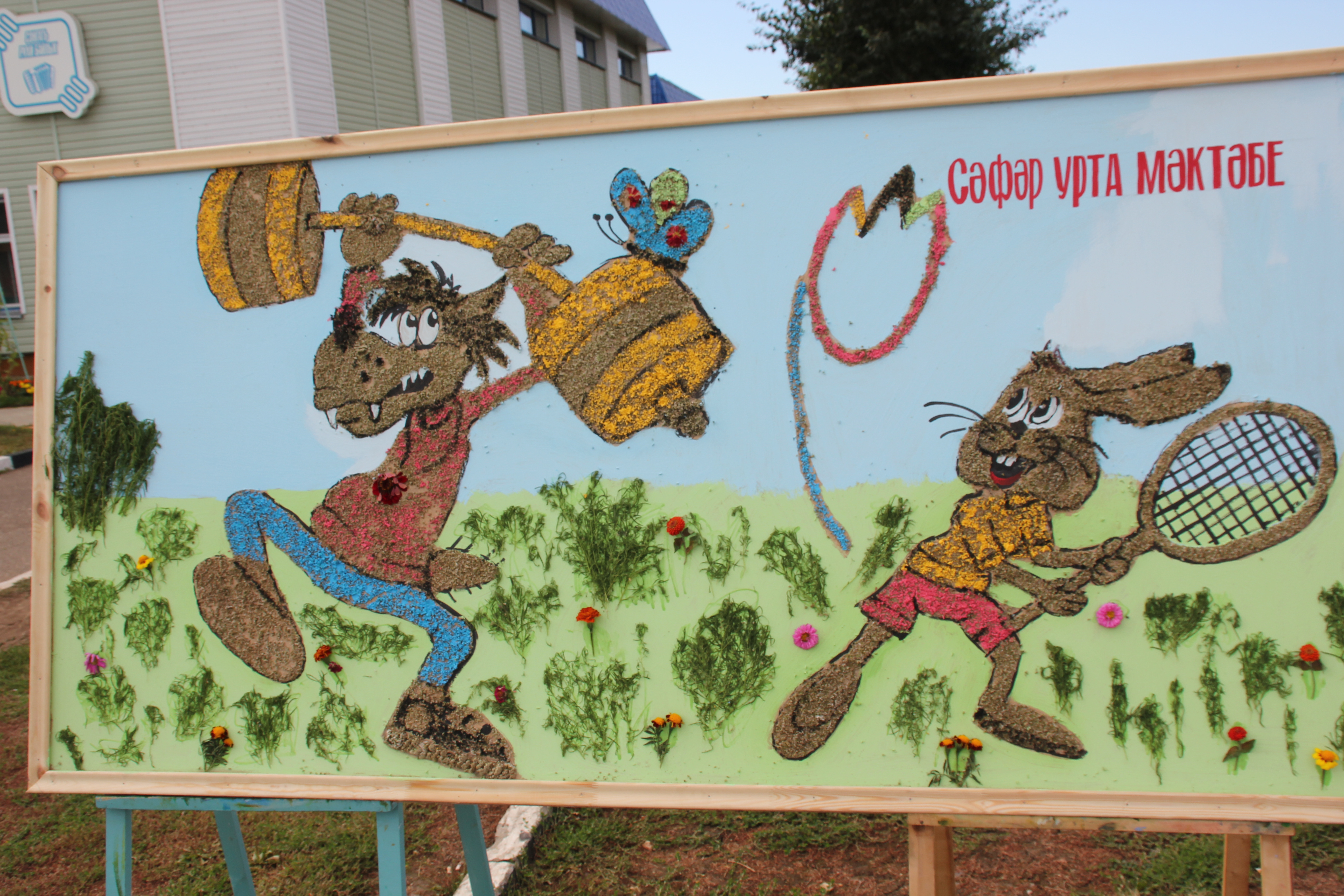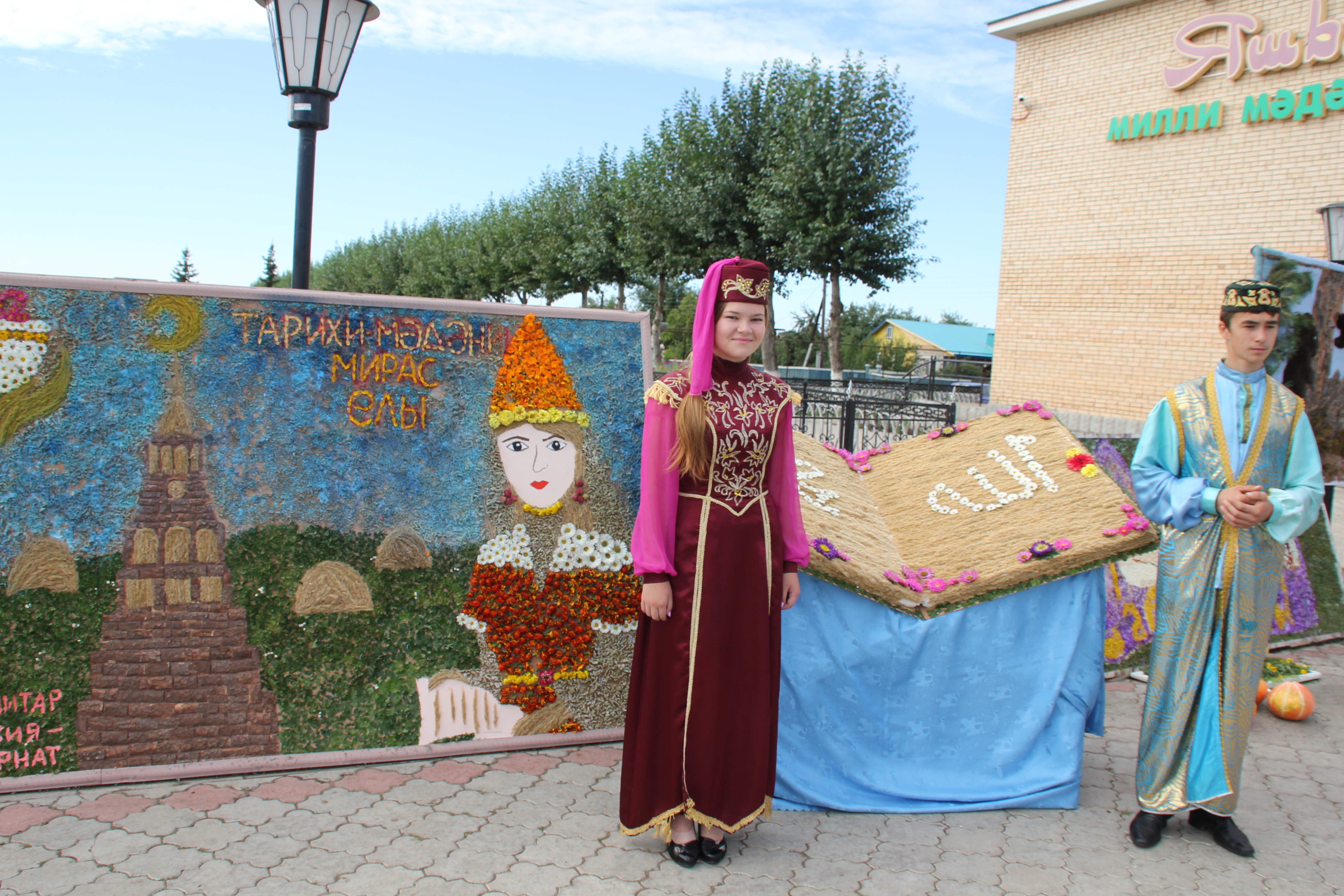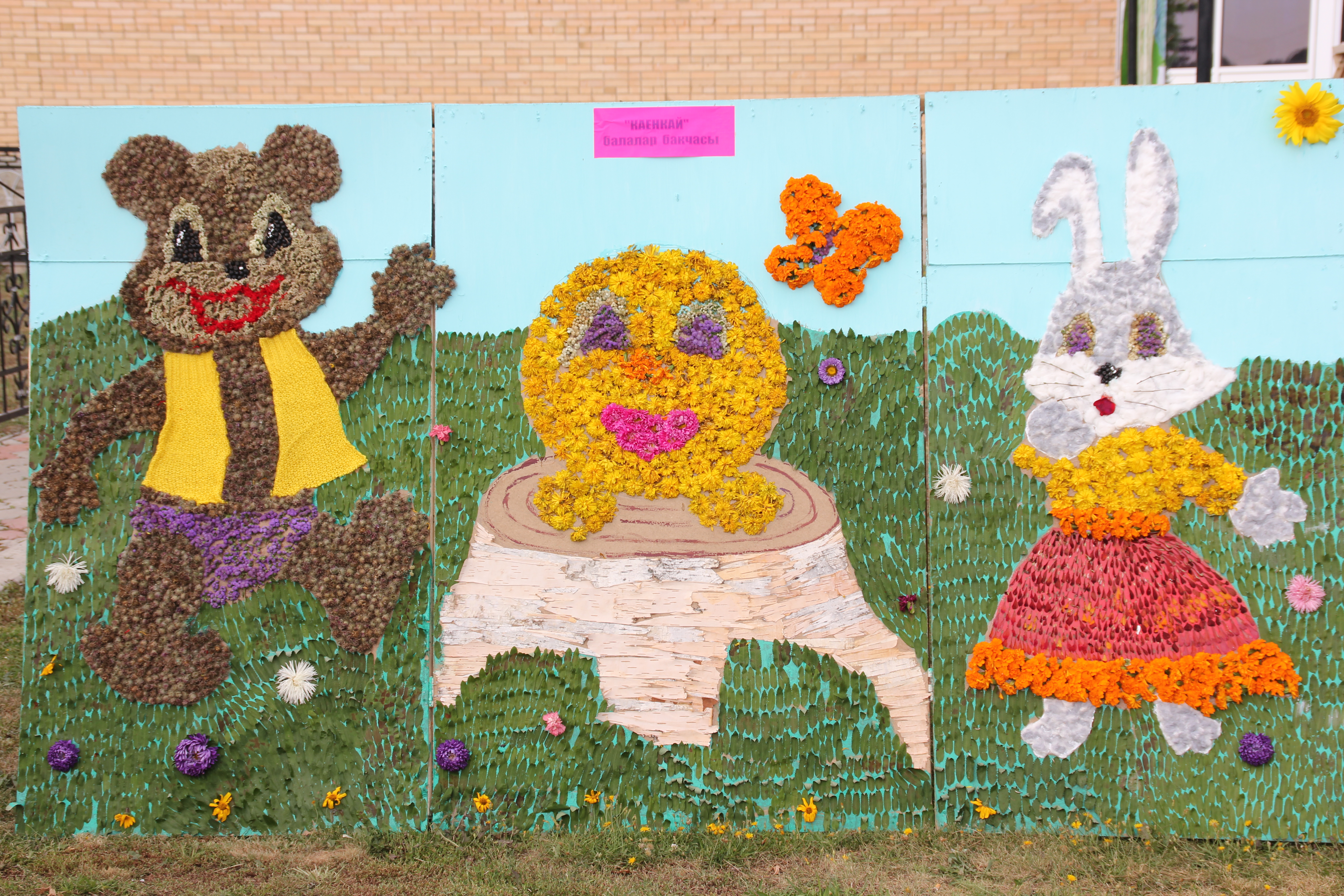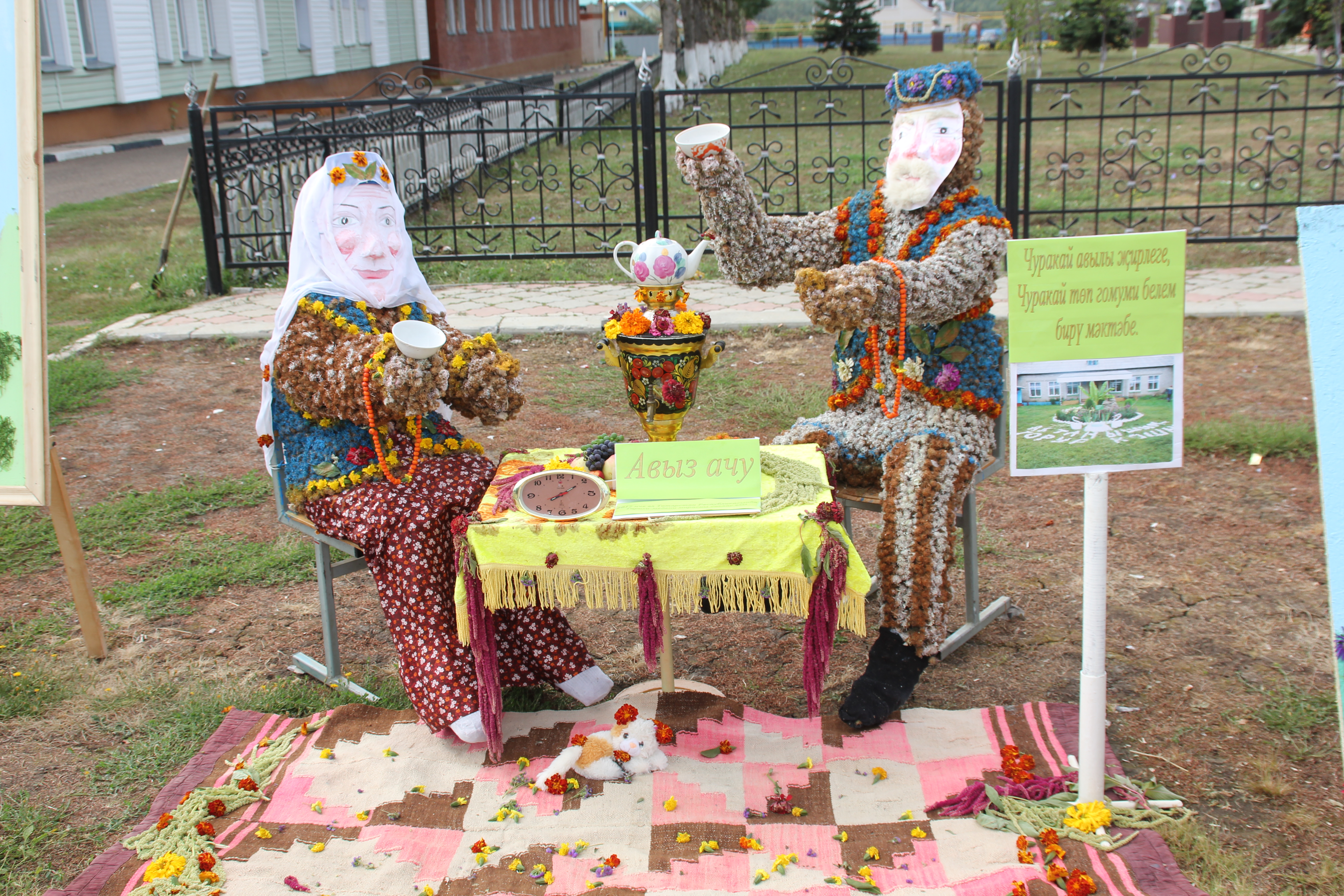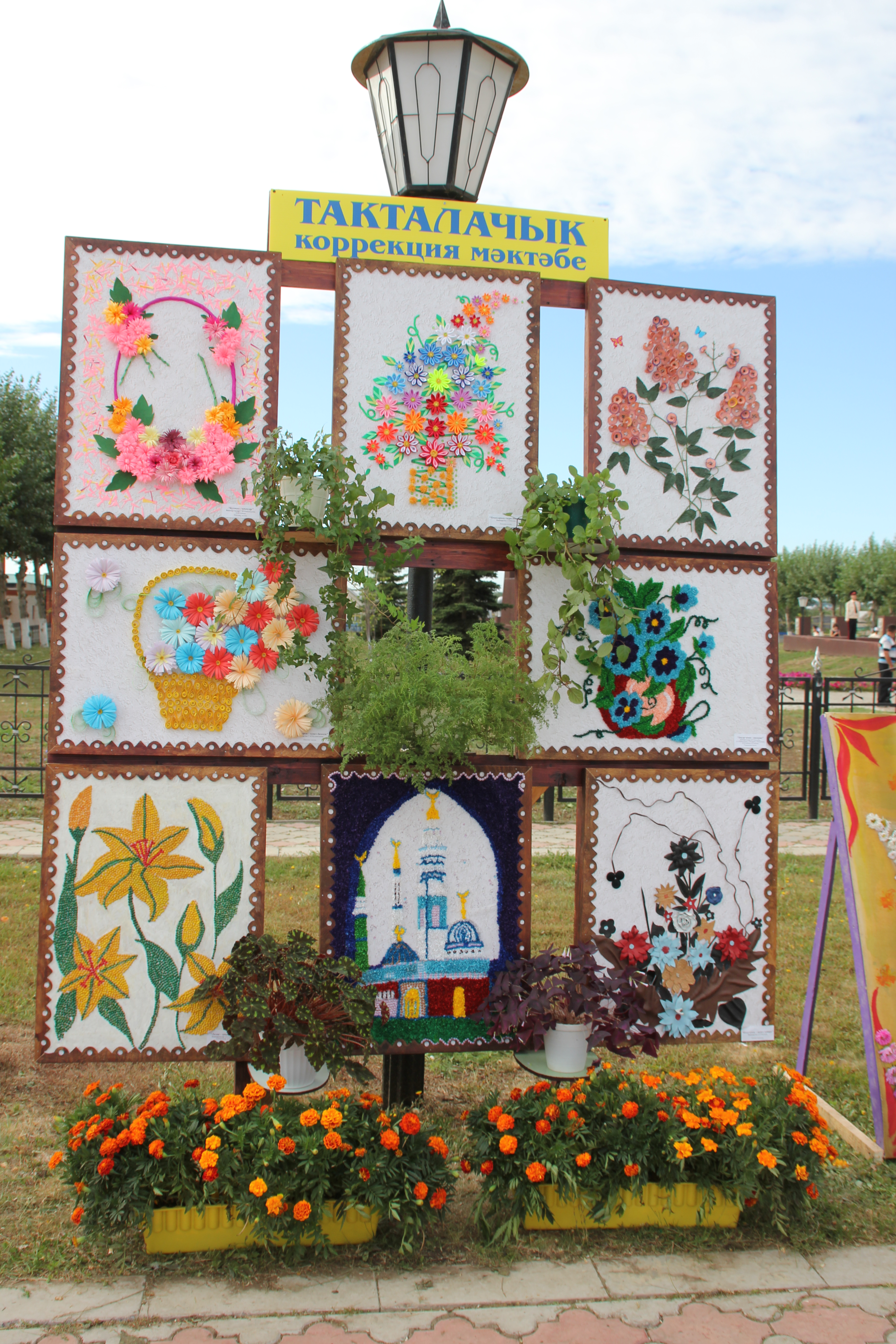 Панно из цветов; алые, белые розы, пахнущие картофелью и свеклой; куклы в татарских национальных костюмах – все композиции выполнены с огромной любовью.