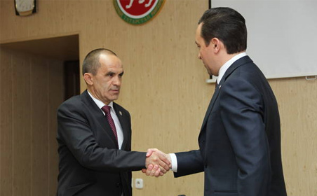 Глава Правительства зачитал Указ Президента РТ о назначении Энгеля Фаттахова, бывшего главы Актанышского района РТ. По традиции, вновь назначенному министру вручили портфель и значок.