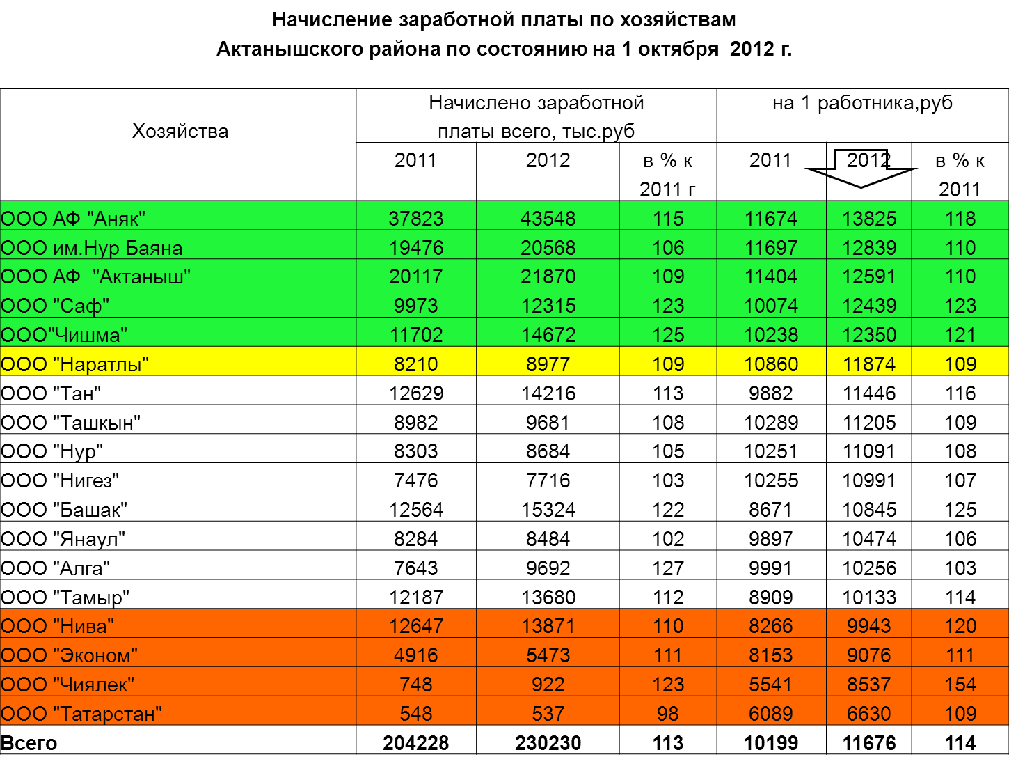 Следует отметить, что на сегодняшний день сумма средней заработной платы в хозяйствах составляет 11676 рублей (на 1 октября 2011 года –10199 р.). По сравнению с районными показателями, заработные платы выше в а/ф «Аняк», «Актаныш», ООО «им. Нур Баян», ООО «Чишма», ООО «Саф»; а в ООО «Татарстан» - всего 6630 р., ООО «Чиялек» - 8537 р.