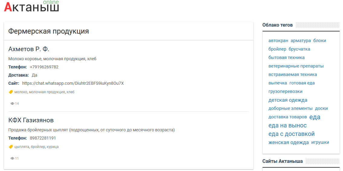 Проект под названием aktanysh-online.ru объединил в себе 14 направлений. В основном, здесь представлена торговля: продукция фермеров, товары для детей, бытовая техника, одежда-обувь, канцелярские принадлежности, строительные материалы, товары садоводам, охотникам и рыболовам, готовая еда.