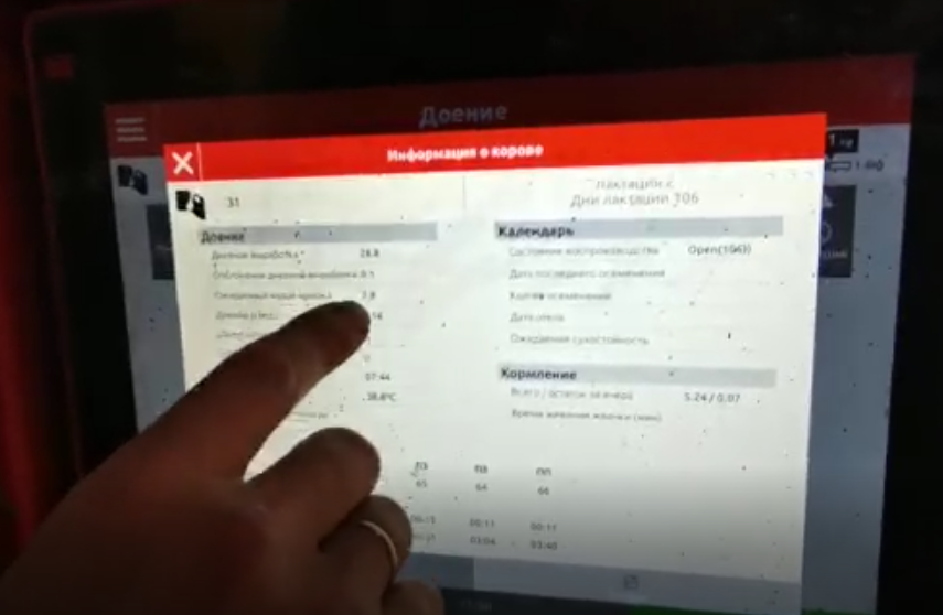 Затем приступают к доению. Специальная программа, установленная на компьютере, показывает все данные о животном. Дает сведения о потомстве, здоровье и молочных показателях коровы.