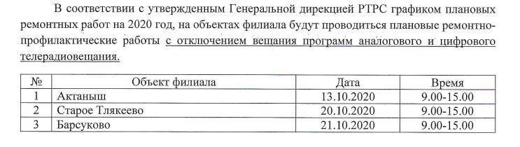 О проведении плановых работ на объектах филиала РТРС.
