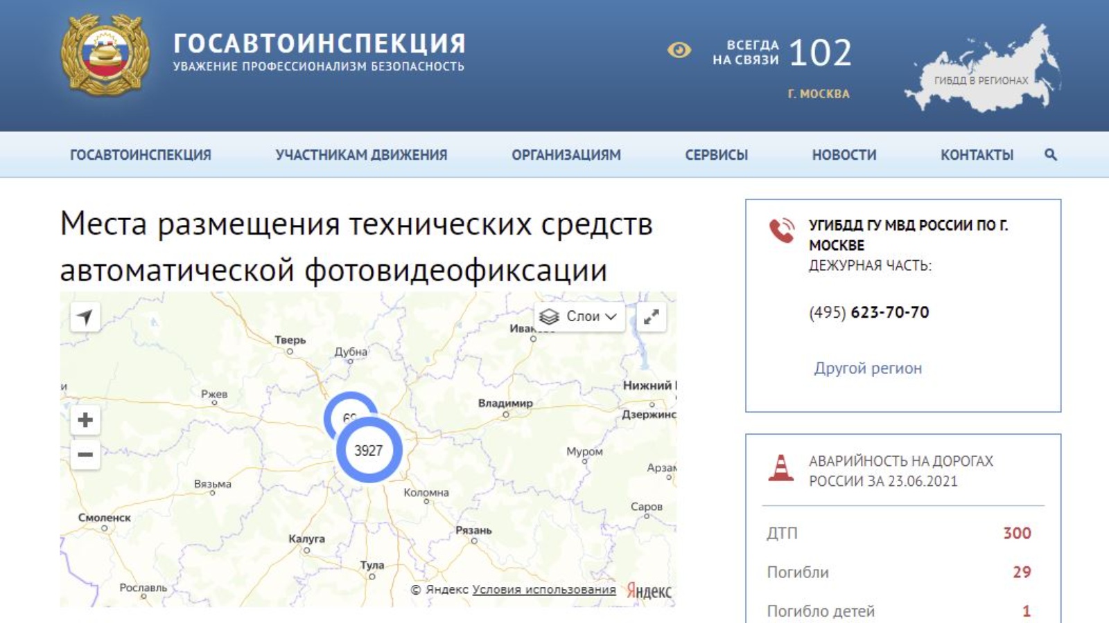 ГИБДД в тестовом режиме запустила на своём сайте новый интерактивный раздел, в котором представлена информация о местах размещения работающих в автоматическом режиме специальных технических средств, имеющих функции фото- и киносъёмки, видеозаписи для фиксации нарушений ПДД.