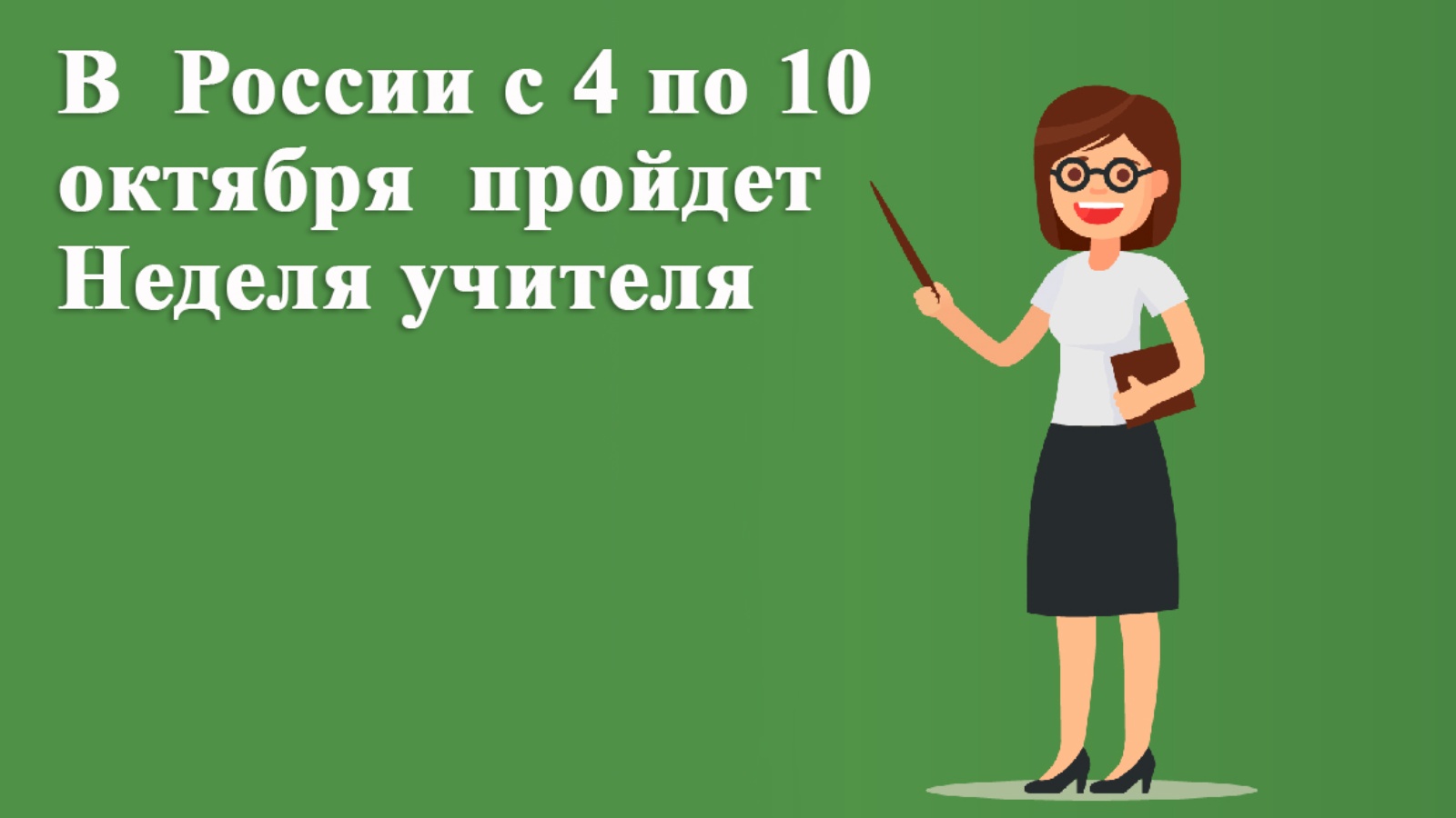 В России с 4 по 10 октября пройдет Неделя учителя, которая будет включать мероприятия, посвященные профессии педагога и направленные на ее популяризацию. В образовательных учреждениях Неделя учителя пройдет по отдельному плану МКУ «Управление образования», где предусмотрены такие мероприятия, как конкурс рисунков, конкурс сочинений, праздничные концерты, праздничные мероприятия, акция «Помоги пожилому учителю», «Праздничная почта» в бумажном и электронном вариантах, «Пресс-стена» - информационный блок о педагогах, их увлечениях, интересных событиях, позволяющих раскрыть интересные стороны их жизни.