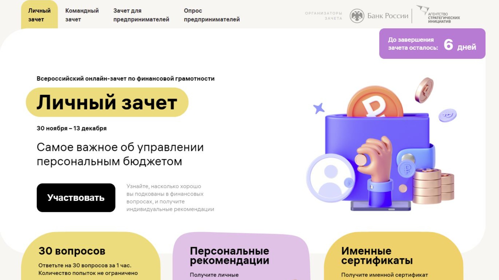 Повышение финансовой грамотности в настоящее время является одной из приоритетных задач органов власти. От принятия населением и бизнесом взвешенных и грамотных финансовых решений, снижения рисков мошеннических действий в конечном итоге зависит и развитие экономики в целом. Важность реализации комплекса мер по финансовому просвещению отражена и в Ежегодном послании Президента Республики Татарстан Государственному Совету Республики Татарстан о внутреннем и внешнем положении республики (от 8 октября 2021 года). С целью оценки уровня финансовых знаний и привлечения внимания к важности вопросов повышения финансовой грамотности ежегодно при поддержке Агентства стратегических инициатив проводится Всероссийский онлайн-зачет по финансовой грамотности. В прошлом году Республика Татарстан заняла первое место в Российской Федерации, показав максимальную активность как среди населения (более 90 тысяч человек), так и предприятий (порядка 2 300 субъектов МСП). В этом году финансовый зачет проводится в период с 30 ноября по 16 декабря. Количество попыток сдачи теста не ограничено. При успешной сдаче участники получат именной сертификат. Впервые предусмотрена возможность пройти зачет не только индивидуально, но и попробовать свои силы в командном соревновании. Пройти зачет можно на сайте finzachet2021.ru. Дополнительно будет проходить опрос субъектов малого и среднего предпринимательства относительно востребованности финансовых услуг и удовлетворенности ими.