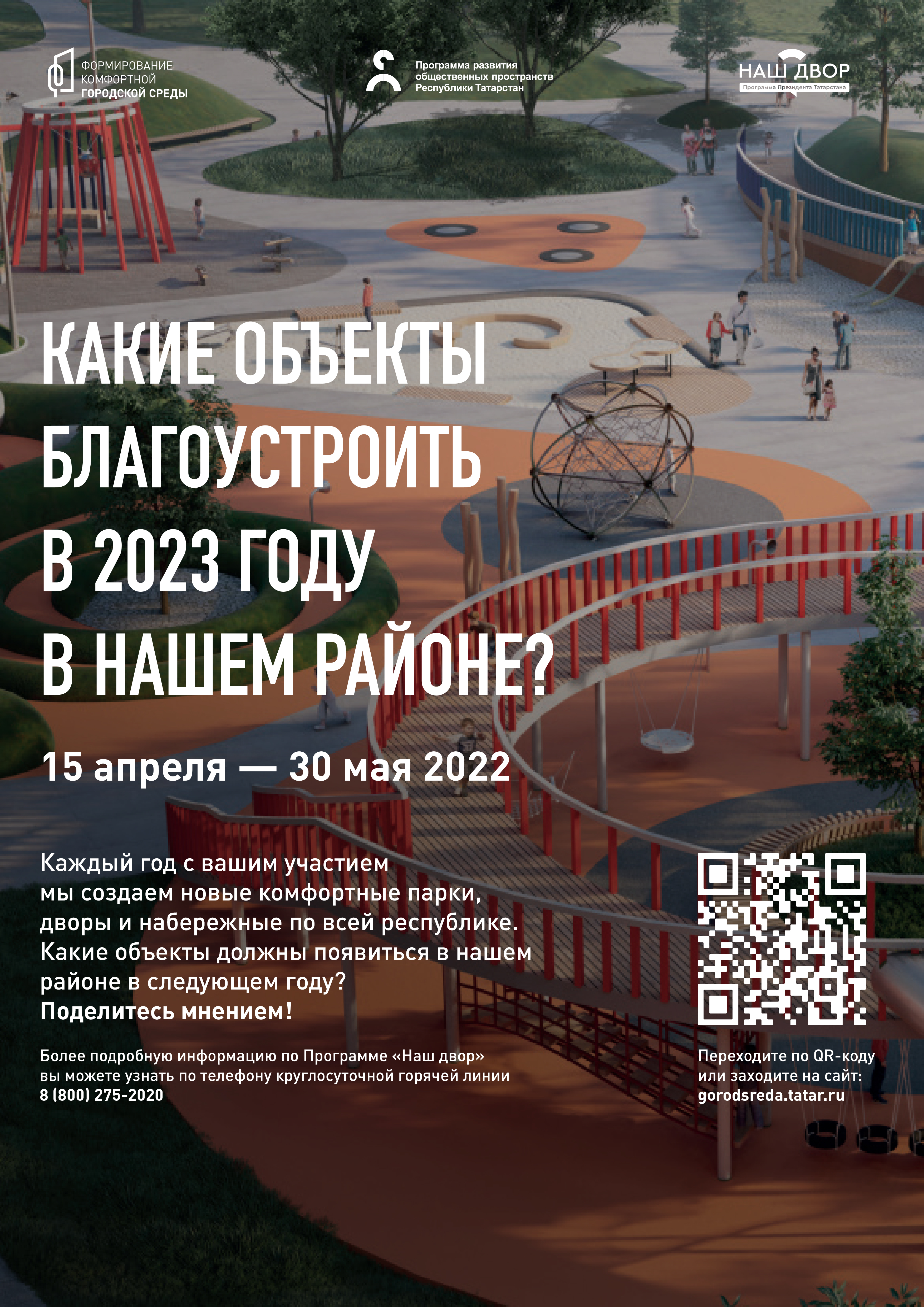 В целях вовлечения граждан к реализации федерального проекта «Формирование комфортной городской среды» Минстроем России совместно с АНО «Диалог Регионы» принято решение о проведении голосования по отбору общественных пространств, планируемых к благоустройству в 2023 году на единой федеральной платформе, которое состоится с 15 апреля по 30 мая 2022 года. Для Республики Татарстан Минстроем России согласовано проведение рейтингового голосования по выбору общественных пространств, планируемых к благоустройству в 2023 году на Портале государственных и муниципальных услуг Республики Татарстан через сервис «Опросы жителей» и в мобильном приложении «Услуги РТ».