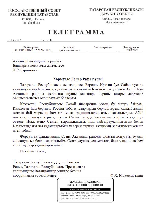 Пользуясь случаем, поздравляю вас с избранием депутатом Совета Актанышского района. Желаю вам крепкого здоровья, счастья, благополучия и больших успехов в работе!