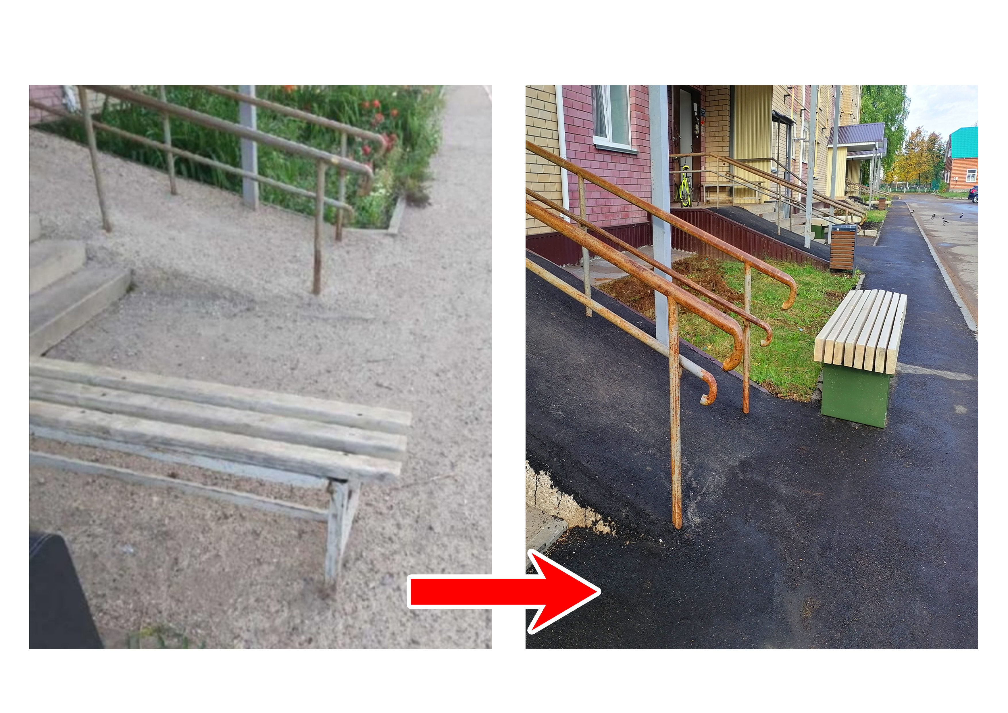 В конце августа вы встречались с нами и ни один вопрос не остался без ответа. В срочном порядке были сделаны отмостки, тротуары, обновлены подъезды по требованиям доступной среды, установлены скамейки. Мы очень долго ждали этих обновлений. Искренне благодарим вас! Удачи вам!