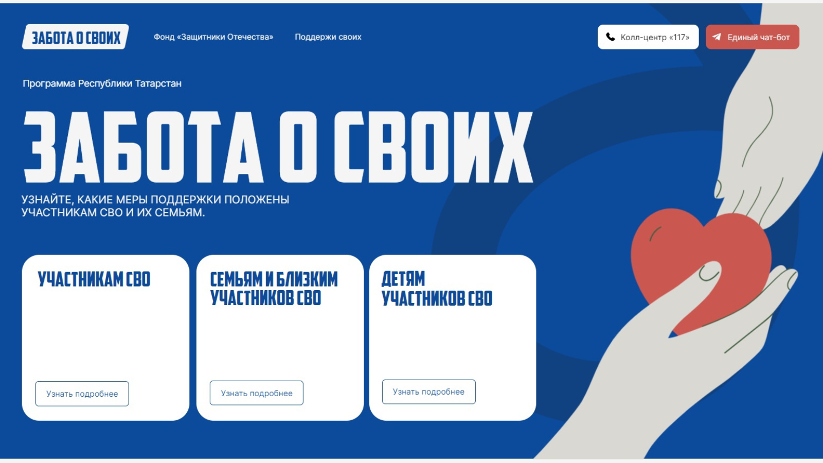В рамках республиканской программы «Забота о своих» в Татарстане в тестовом режиме заработал сайт zabotasvo.tatar. На сайте размещена адаптированная информация по мерам поддержки для разных категорий граждан. На ресурсе также создана возможность оставить заявку с вопросом по мерам поддержки.