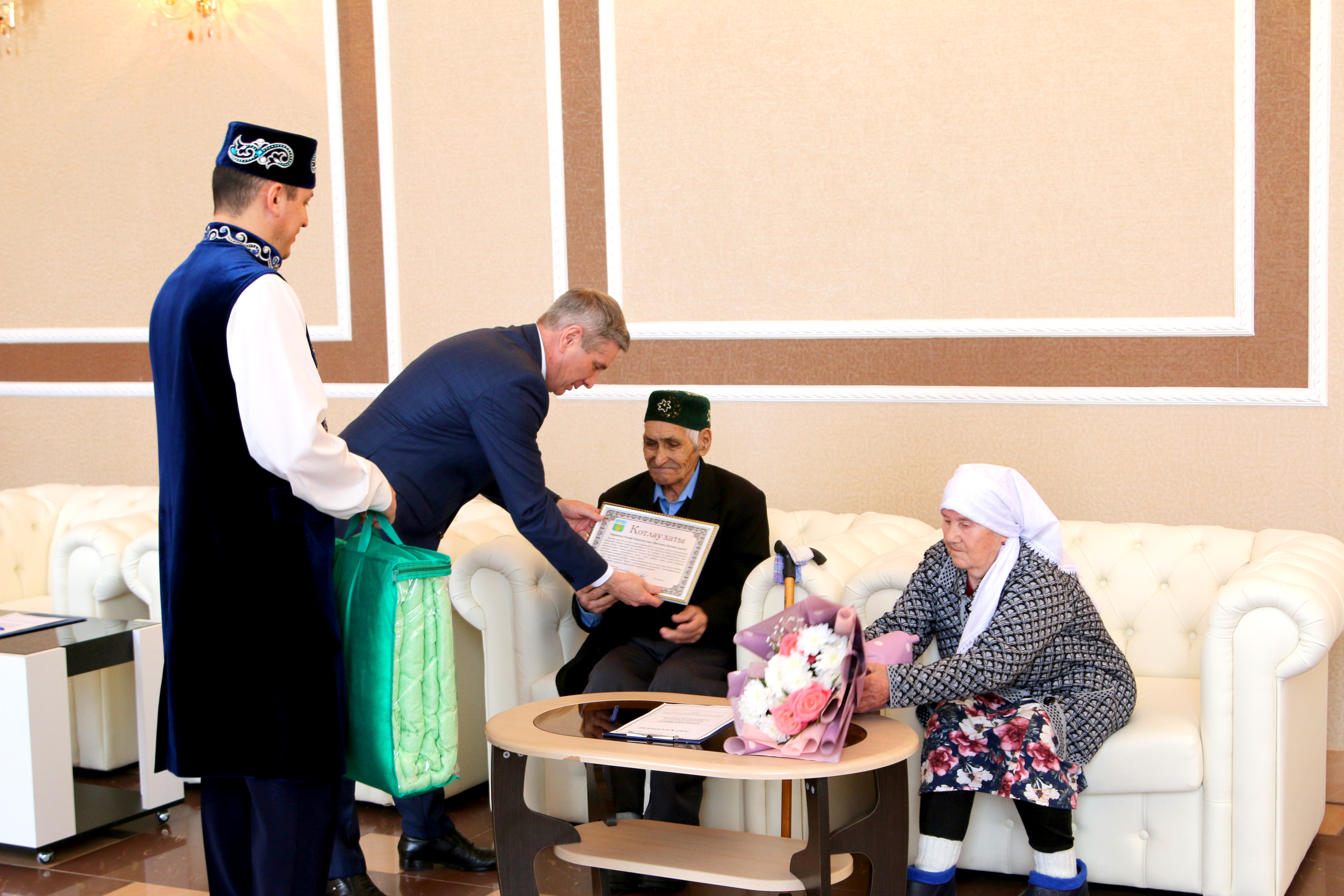 В торжественной церемонии принял участие глава района Ленар Зарипов. Он поздравил всех присутсвующих, которые на протяжении многих лет сохранили семейные ценности и являются примером для подрастающего поколения с праздником и пожелал им здоровья, счастья и благополучия..jpg)