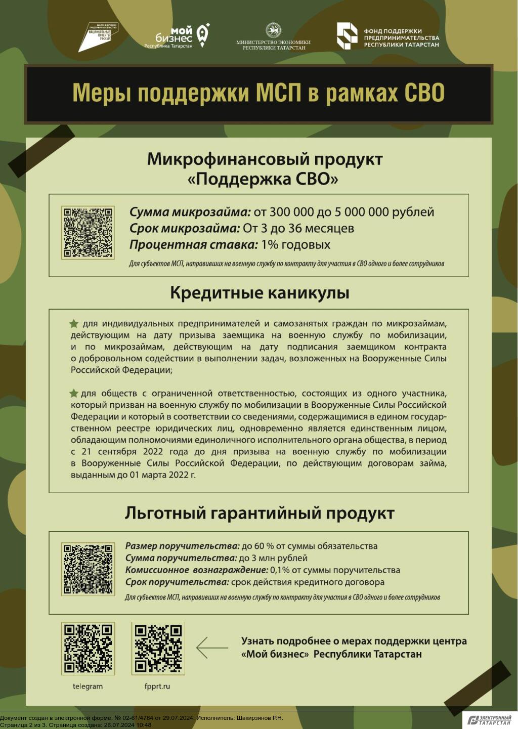 Некоммерческая микрокредитная компания «Фонд поддержки предпринимательства Республики Татарстан» с 08.07.2024 вводит льготную ставку по финансовому продукту «Поддержка СВО» для субъектов малого и среднего предпринимательства, направивших на военную службу по контракту одного или более военнообязанных работников.