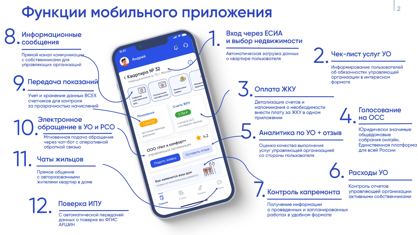 - Просматривать и оплачивать счета за ЖКУ