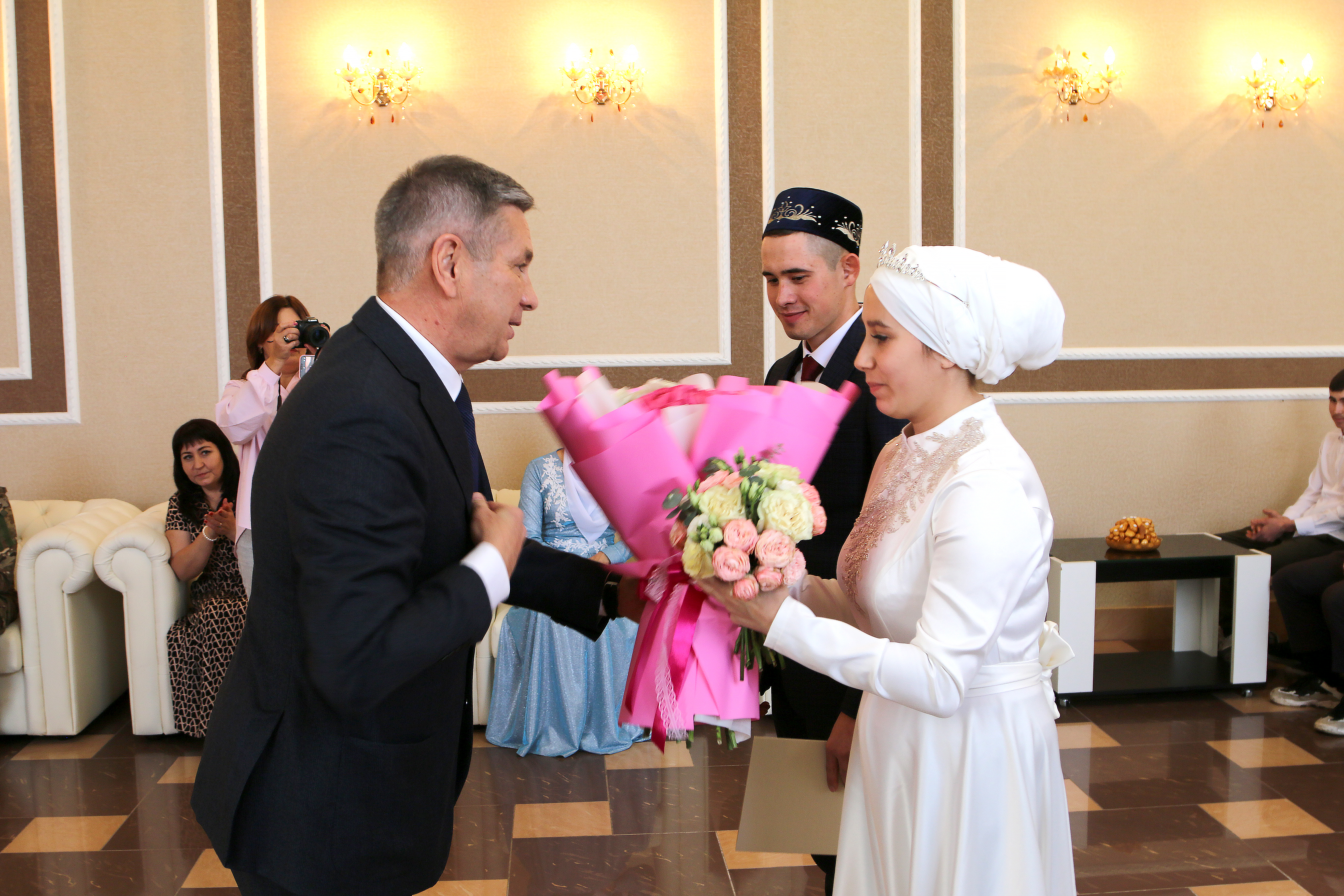 Поздравление молодоженам прозвучало из уст главы района Ленара Зарипова. Он отметил, что каждый новый союз – это вклад в будущее, основа для крепкой семьи и, соответственно, крепкого общества. Глава выразил надежду, что Данияр и Лиана станут примером для многих, вдохновляя других на создание семейных ценностей..jpg)