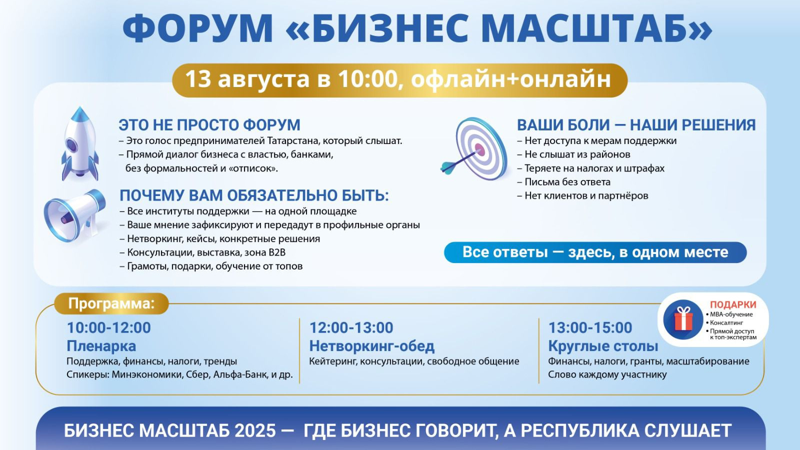 Ассоциация предприятий малого и среднего бизнеса Республики Татарстан при поддержке Общественной Палаты Республики Татарстан и Министерства Экономики Республики Татарстан приглашает на республиканскую конференцию «БИЗНЕС МАСШТАБ. ФИНАНСОВАЯ ЭКОСИСТЕМА БИЗНЕСА и ГОЛОС ПРЕДПРИНИМАТЕЛЕЙ». Конференция состоится 13 августа 2025 г. с 10:00 до 16:00 в г. Казань, ул. Петербургская, д. 28.