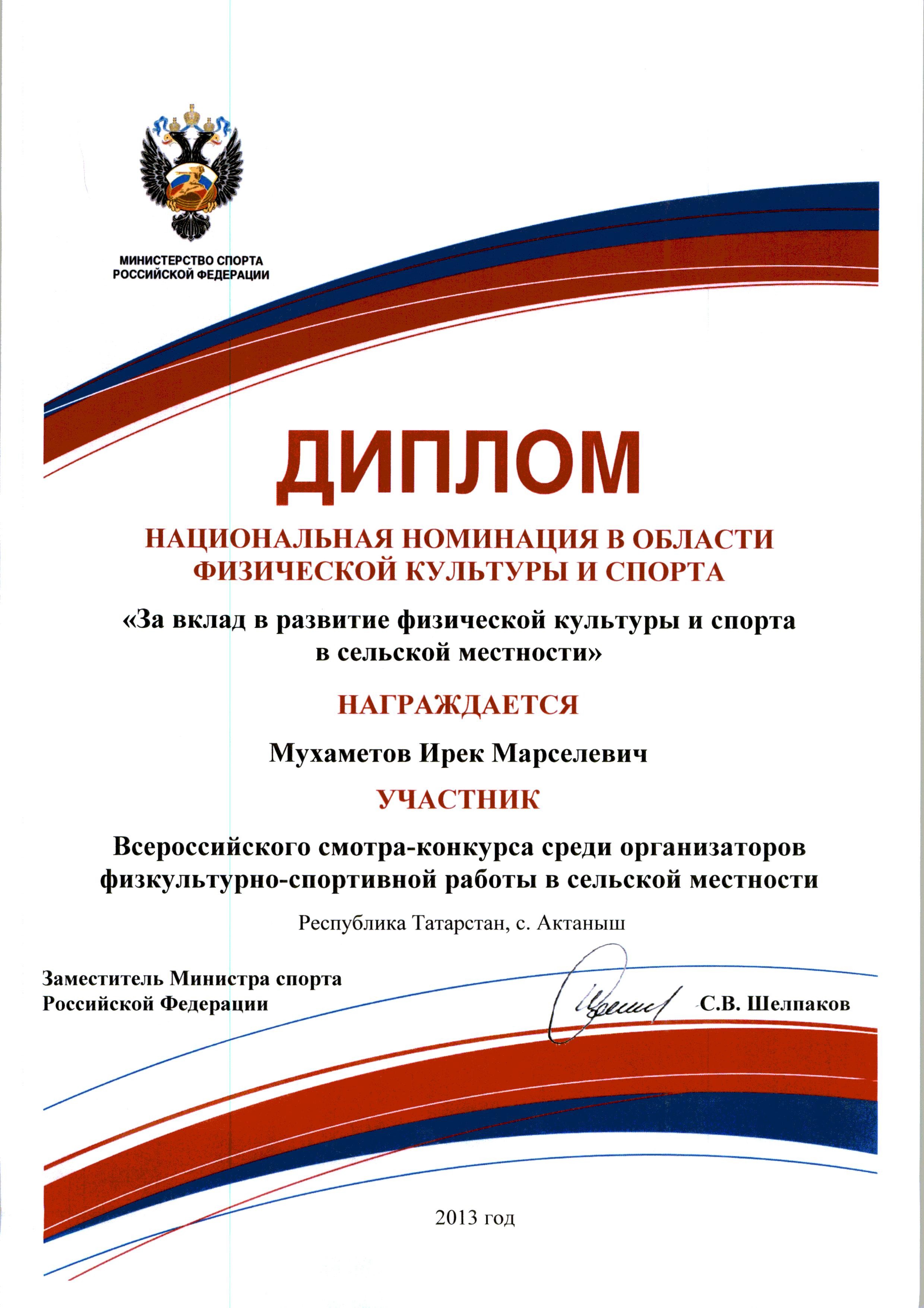 Ирек Мухаметов, учитель физической культуры Актанышской средней школы №1 стал победителем Всероссийского смотра-конкурса на лучшую постановку физкультурно-спортивной работы среди предприятий, учреждений и организаций по итогам 2013 года. Он награжден Дипломом Министерства спорта РФ в национальной номинации в области физической культуры и спорта «За вклад в развитие физической культуры и спорта в сельской местности»