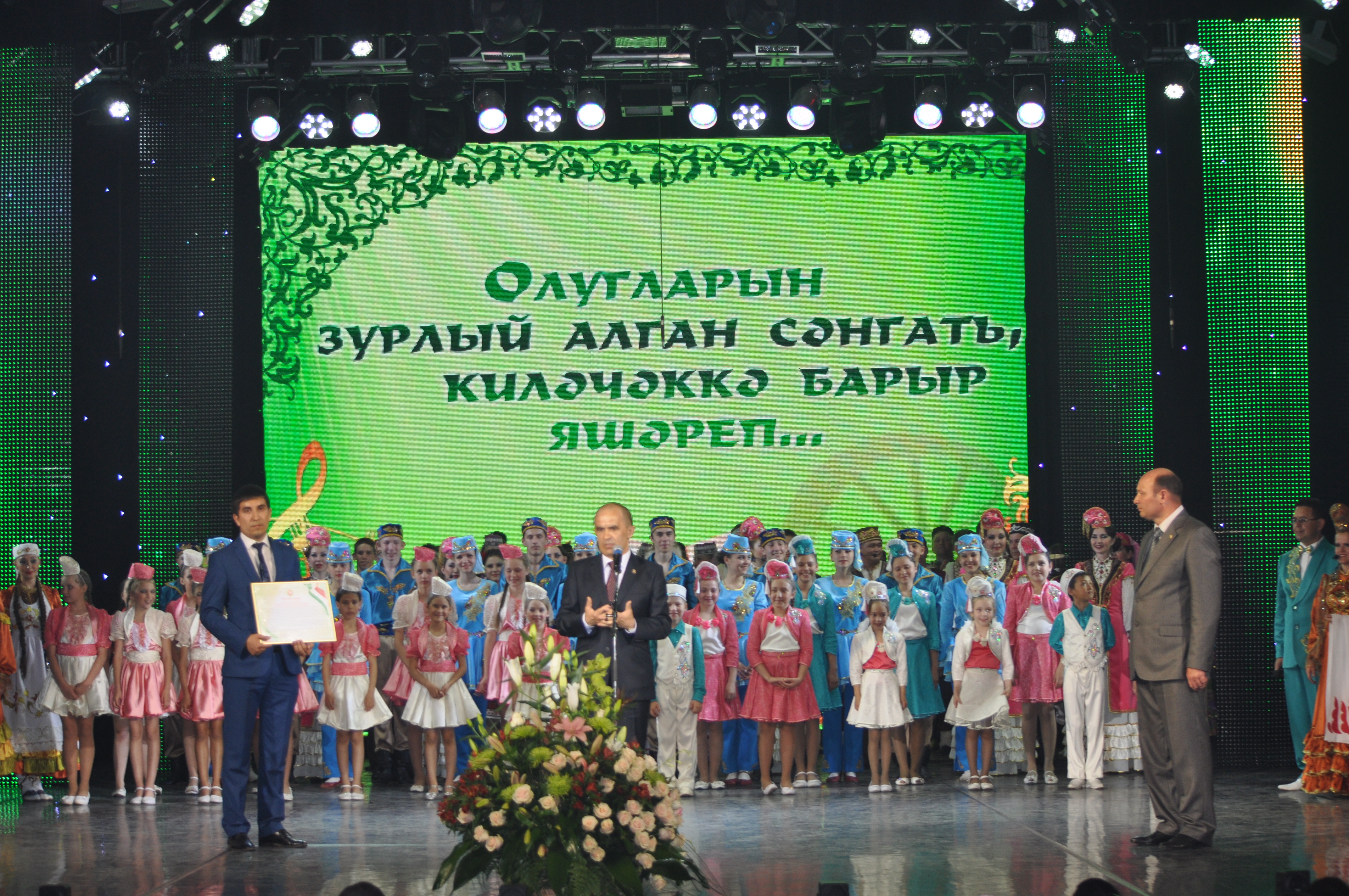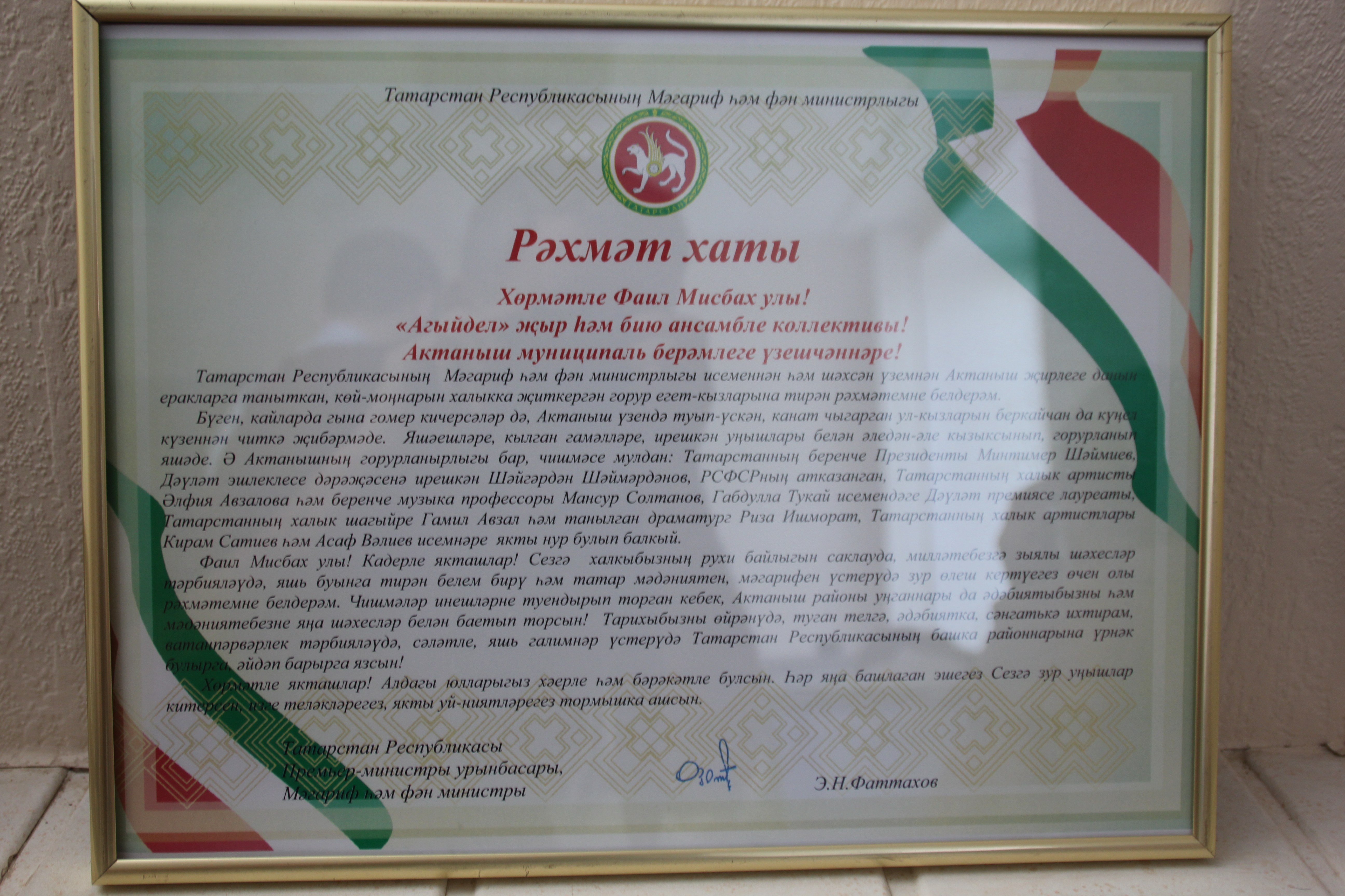 Энгель Фаттахов после концерта дал высокую оценку выступлению мастеров художественной самодеятельности Актанышского района, признал, что за последние 2 года мастерство самодеятельных артистов существенно возросло и наградил главу муниципального района Фаиля Камаева Благодарственным письмом Министерства образования и науки РТ.