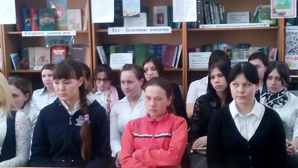 1 апреля в читальном зале центральной библиотеки на очередном заседании районного комитета по культуре общественной организации "Ак калфак" учащиеся Актанышского технологического техникума встретились с заместителем главного врача Актанышской районной больницы, врачом-гинекологом, председателем районного комитета по здоровью общественной организации "Ак калфак" Разетдиновой Анжеликой Эдуардовной. Тема встречи "Чисталык сәламәтлек нигезе".