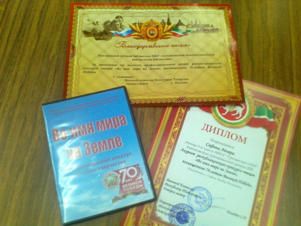 Участвовав в республиканском конкурсе “Во имя мира на земле” Сафина Айзара И Багаветдинова Камиля признаны победителями и награждены дипломами. А Актанышской центральной детской библотеке, за организацию и проведение конкурса на высоком профессиональном уровне, выражена благодарность Военным Комиссаром Р.Т генерал – майором С. Погодиным.