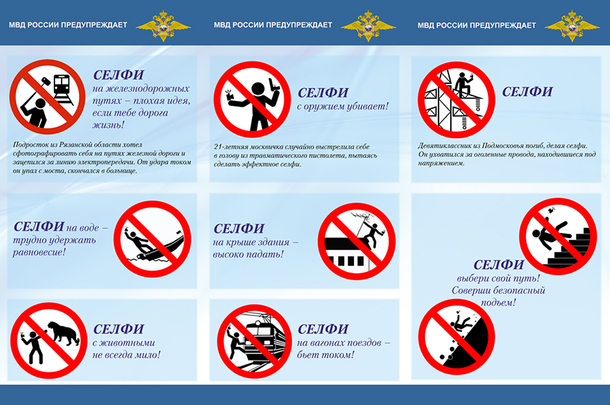 Еще в июле текущего года МВД России представило памятку «Делай безопасные селфи. Крутое селфи может стоить тебе жизни». Задача акции — остановить моду на опасные фотографии и свести к минимуму количество трагических происшествий