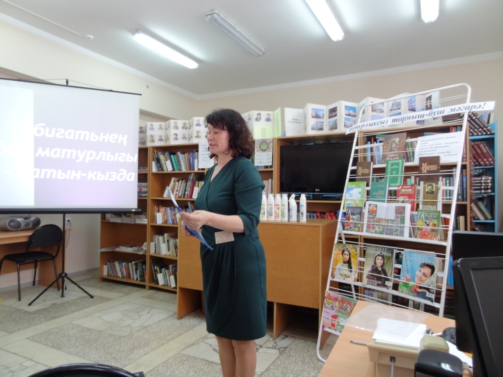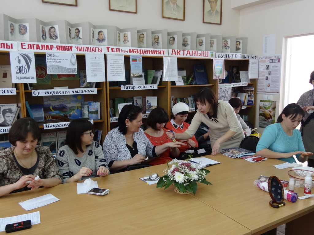 18 марта в читальном зале центральной библиотеки прошло очередное занятие клуба молодых семей "Учак" по теме "Табигатьнең бар матурлыгы хатын-кызда". В занятии цветовод Ахмаева Василя Гайсиевна показала мастер- класс по составлению композиции цветов. Была показана эленктронная презентация по этой теме, проводился тест "Кешенең характерын беләсең килсә фил ясат" . Специалисты салона "Фаберлик" провели беседу о своей продукцией и показали мастер - класс по уходу за кожей рук и лица. Участник клуба, активный читатель библиотеки Расима Зарипова прочитала стих о женской красоте. Была представлена книжная выставка и обзор по теме "Матурлыксыз - тормыш буш мәгарә".