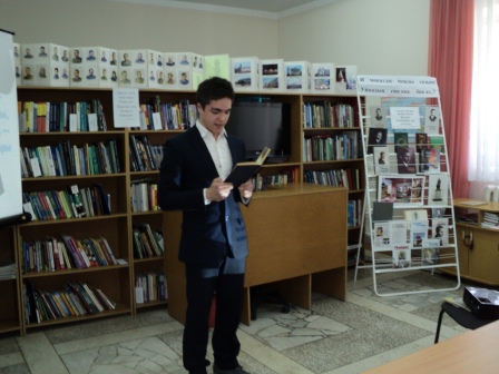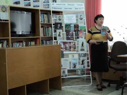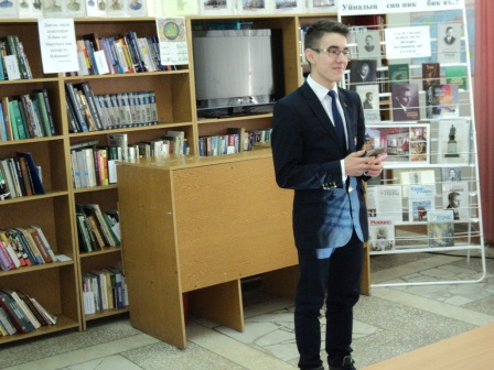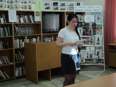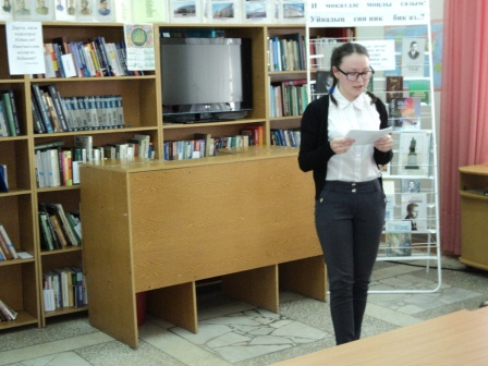 13,14 апреля в читальном зале центральной библиотеки прошел литературный вечер посвященный к 130 - летию Габдуллы Тукая "И мөкатдәс моңлы сазым! Уйнадың син ник бик аз..?". Была показана электронная презентация о жизни и творчестве Габдуллы Тукая "Гомерендә- халкы язмышы, җырларыңда-халкы моңнары". В части мероприятии под названием "Шигъри тәлгәшләр" учащиеся 10 "а","б" классов Актанышской средней школы №2 (кл. руководители Бурханова Г.Д. , Хафизова Т.М.) Гафаров А. , Хафизова З. , Ибрагимова А. , Ахмадуллина А. , Авзалова Ю., Гиздатуллина А. ,Мингазов А., Габдуллин Д. прочитали стихотворения великого поэта "Сөй дөньяны","Тормыш", "Милли моңнар", "Әллүки", "Туган җиремә", "Китап", "Шагыйрь" . А так же на мероприятии выступила активный читатель библиотеки, чтец Фануса апа Галиуллина. Она прочитала стихотворения Габдуллы Тукая "Су анасы". Проведена литературная викторина. Была организована книжная выставка и обзор книг "Г. Тукай-шигърият теле". Учащиеся записаны как читатели библиотеки. Ученики пополнили свой багаж знаний и остались очень довольными.