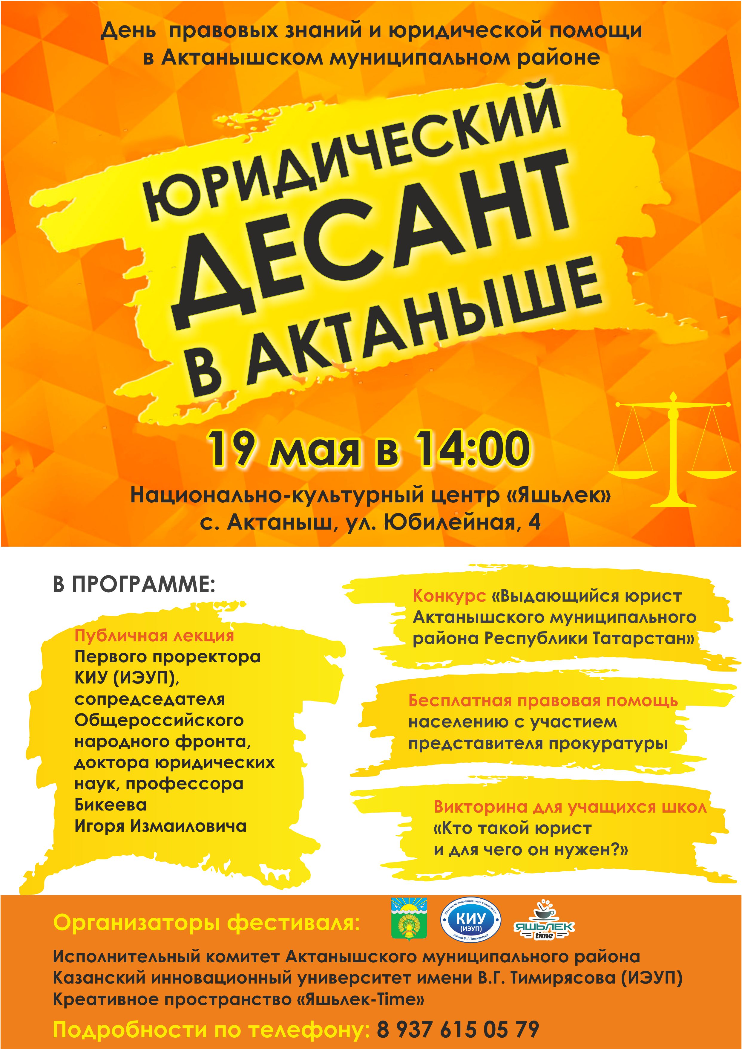 Приглашаем Вас принять участие в профессиональном конкурсе «Выдающийся юрист Актанышского муниципального района Республики Татарстан», который состоится 19 мая 2016 г. в 14 час. 00 мин. по адресу: с. Актаныш, ул. Юбилейная, д. 4, Национально-культурный центр «Яшьлек». Организаторами конкурса являются Исполнительный комитет Актанышского муниципального района Республики Татарстан, Казанский инновационный университет имени В.Г. Тимирясова (ИЭУП), креативное пространство «Яшьлек-time».