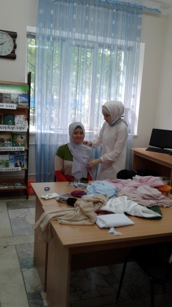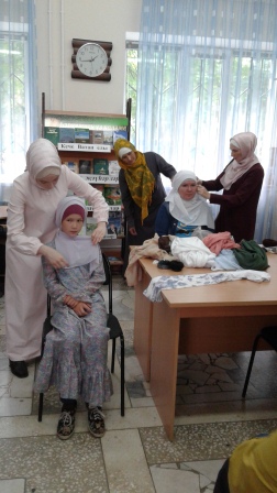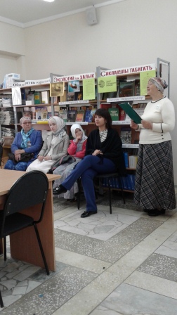 В Центральной библиотеки читального зала клуб “Илһамият”, совместно с мусульманками провели мастер-класс по теме “Яулык бәйләү серләре”. По этой теме был проведён урок. Привели примеры из книги Коръан, были названы аяты из суры, посвященные ношению платка. Мусульманки показывали гостям мастер-класс по ношению платка и палантина. Урок всем понравился и попросили следующий урок.