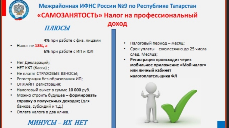 Күп кенә кешеләр үз эшләрен ачарга яки булдырырга күптән хыялланалар иде, ләкин күпләрне шәхси эшмәкәр сыйфатында теркәлгәндә кыенлыклар куркыта, салым органнарына бирү өчен документлар пакеты әзерләргә кирәк. Кешеләрне штрафлар куркыта, табыш алмасам дип тә икеләнә. "Профессиональ керемгә салым” очрагында барлык үзара мөнәсәбәтләр һәм салым исәп-хисаплары кушымтада мобиль телефон аша бара, ә салым бары тик табыш булганда гына түләнә. Табыш юк, салым да юк. Шулай итеп, дәүләт тарафыннан эшмәкәрләр өчен барлык куркынычлар да минимумга җиткерелде.