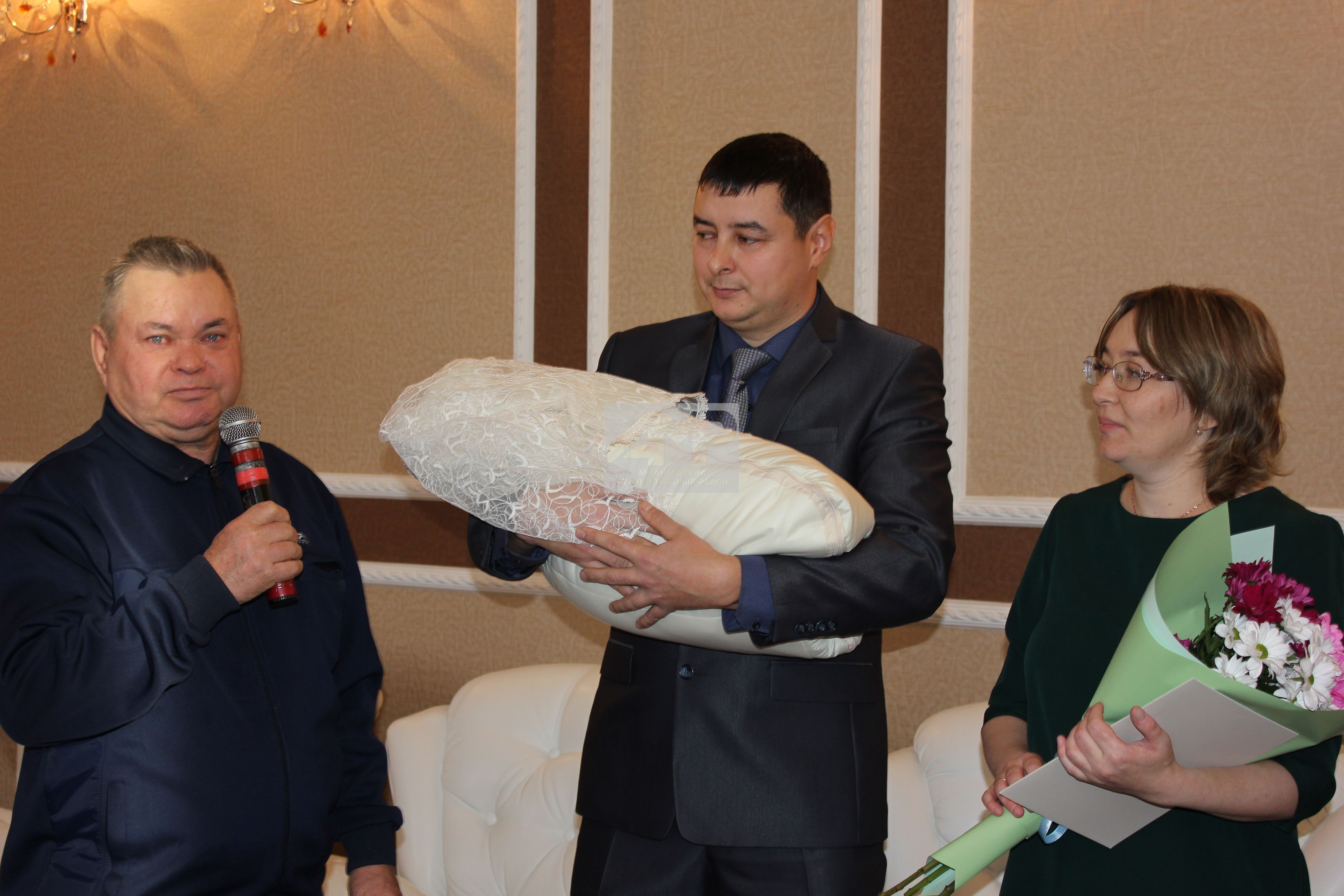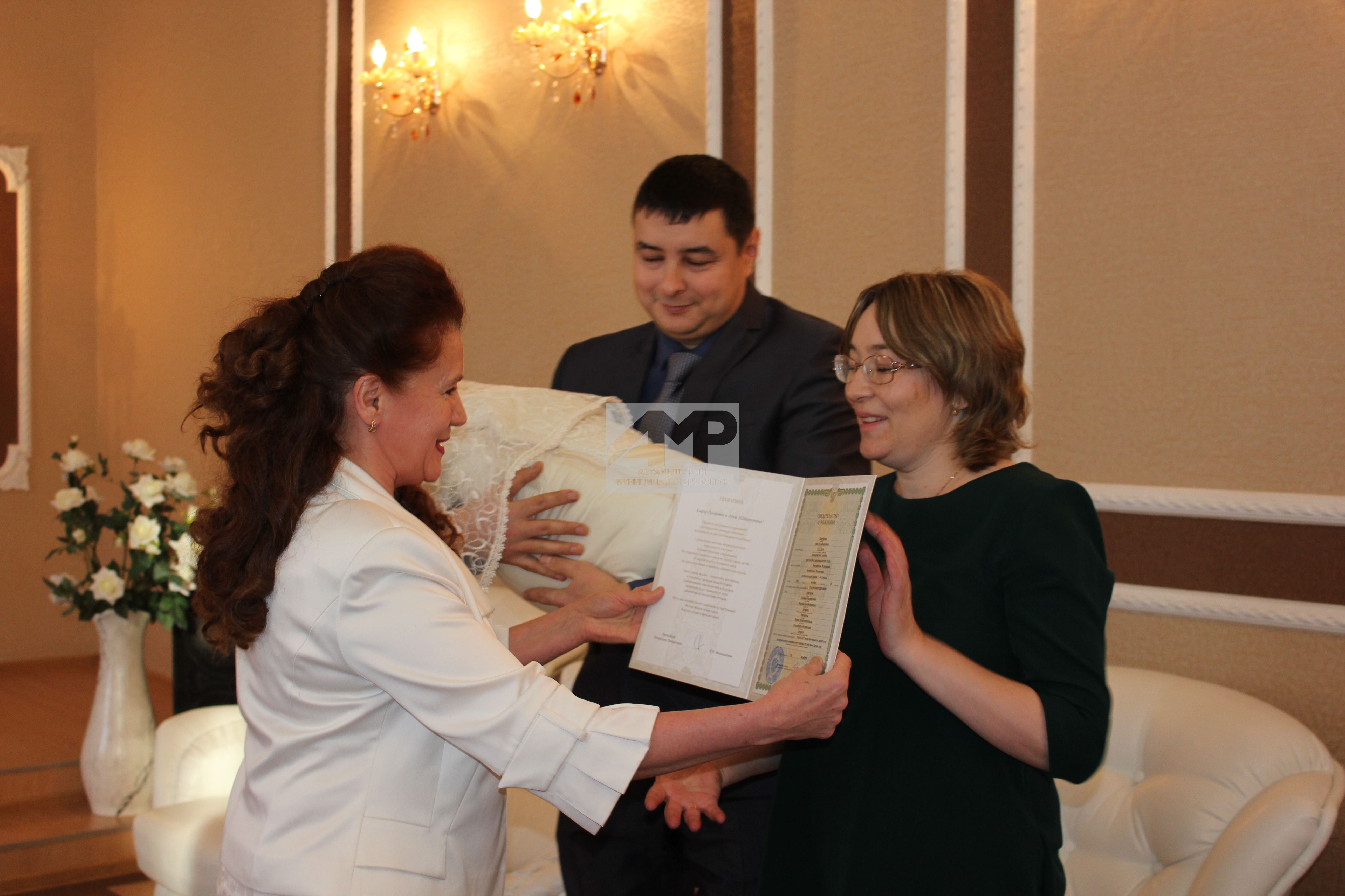 Нәкъ менә әниләр көне уңаеннан оештырылган бәйрәм тантанасында район ЗАГС булеге житәкчесе Гөлфинә Баян кызы Мөхәмәдиева яшь парны өченче тапкыр әти-әни булулары белән котлап, чын күңелдән аларга тигезлек, балаларын сау-сәламәт, бәхетле итеп үстерүләрен теләде. Җитәкче Рәвефевлар гаиләсенә Аизаның туу турындагы таныклыгы белән беррәттән Татарстан Президентының шәхси котлау хатын да тапшырды.