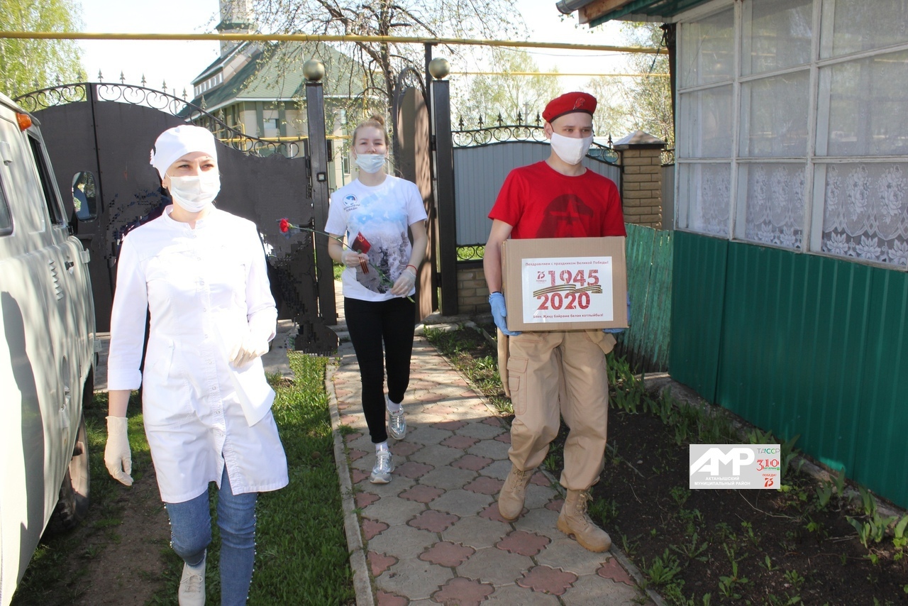 Мәгариф идарәсеннән Айнур Гыймадиев җитәкчелегендәге Җиңү волонтерлары Лиана Шәрәфиева һәм Илдар Мөхәммәтдинов, волонтер-медик Илзирә Баймуллина ветераннар белән очраша, аларга Бөек Җиңү өчен ихлас рәхмәт сүзләрен җиткерәләр, 9 май бәйрәме белән котлыйлар һәм хәйриячеләр акчасына сатып алынган азык-төлек җыелмалары тапшыралар.