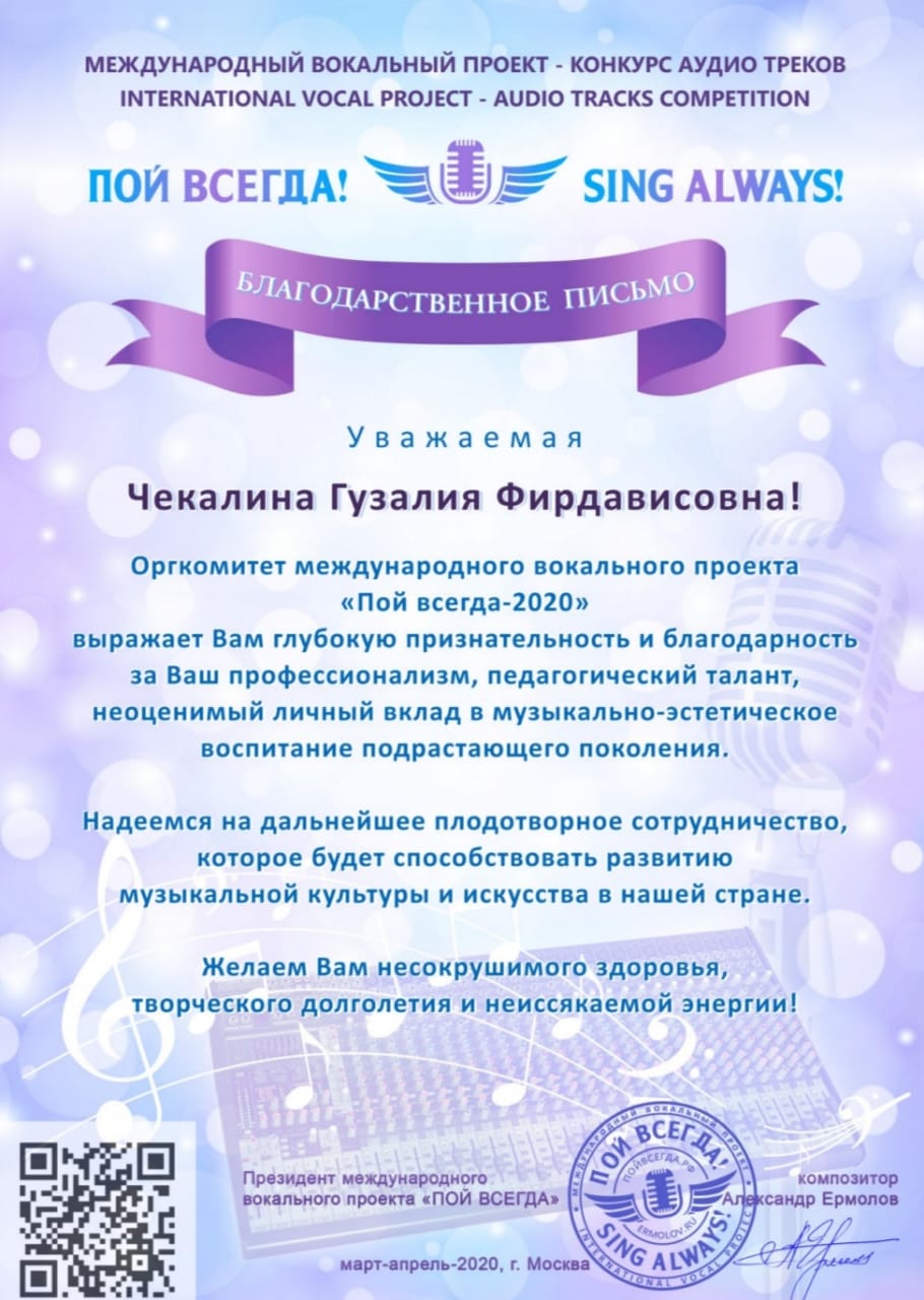 Актаныш сәнгать мәктәбендә Гүзәлия Чекалина җитәкчелегендә шөгыльләнүче Алинә Гафурова 1 февральдән 30 апрельгә кадәраралыкта узган Халыкара“Һәрвакыт җырла” (“Пой всегда”)дип исемләнгән аудиотреклар проектында катнашты. Аның нәтиҗәләре буенча райондашыбыз II дәрәҗә лауреат исеменә лаек булды.Алинә – диплом, аның укытучысы Гүзәлия Фирдәвис кызы Рәхмәт хаты белән хөрмәтләнде. Ихлас күңелдән тәбрик итәбез!