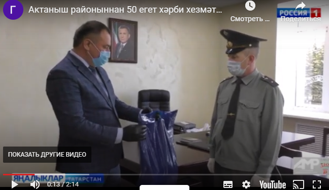 Республикада хәрби хезмәткә язгы чакырылыш дәвам итә. Актаныш районыннан да 50 егет хәрби хезмәткә китәргә җыена. Хәзерге көндә алар медицина тикшерүен уза. Район комиссариатында коронавирус инфекциясен таратмау өчен барлык санитар таләпләр үтәлә. Ишек тоткалары урап куелган, махсус эремә белән эшкәртелә. Бүлмәләр ике сәгать саен җилләтелә. Саклык чаралары белән Татарстан хәрби комиссариаты тәэмин итә. Актаныш районыннан Россия Дәүләт Думасы депутаты булып сайланган Ирек Зиннуров медицина битлекләрен җибәргән.