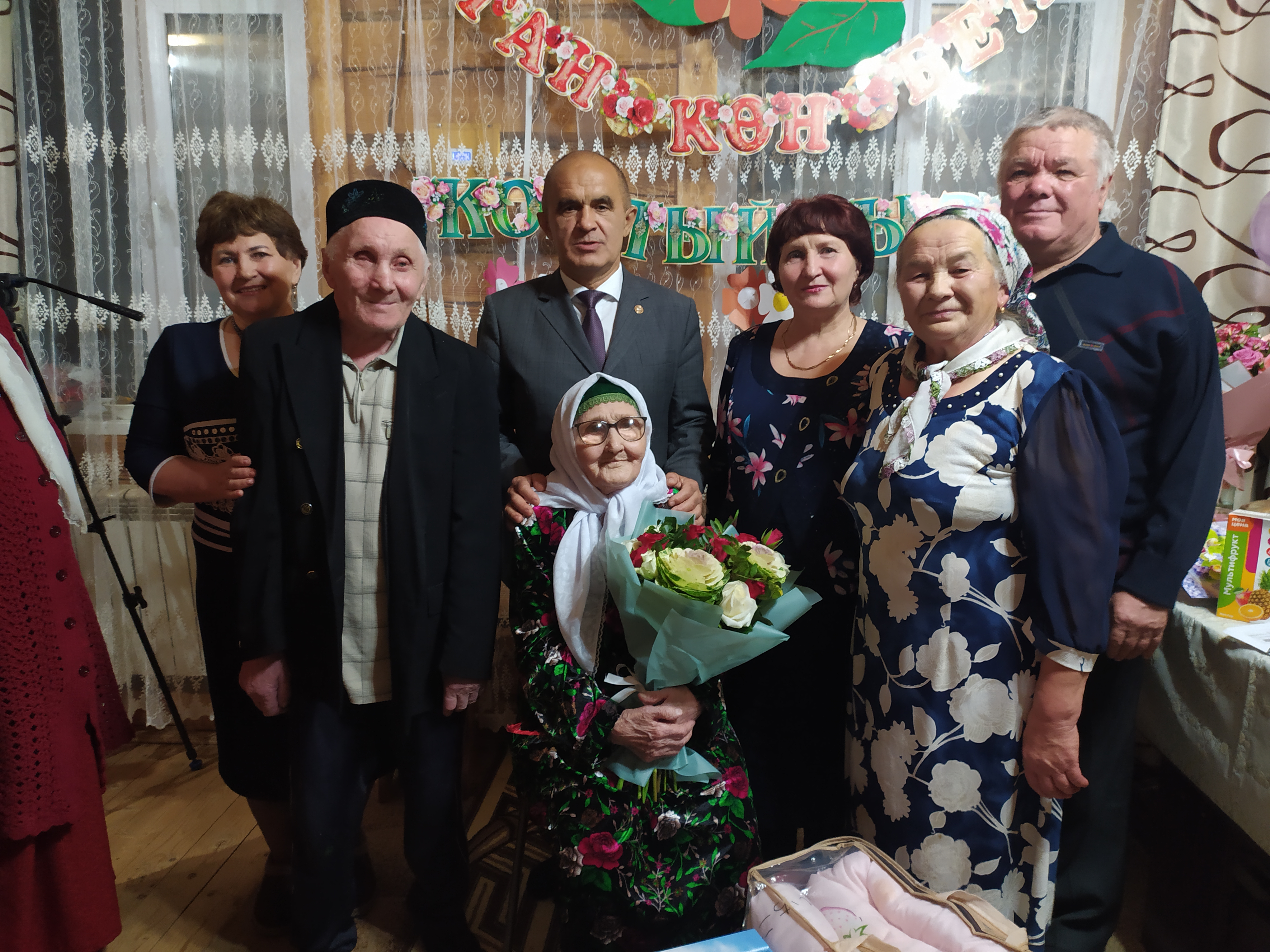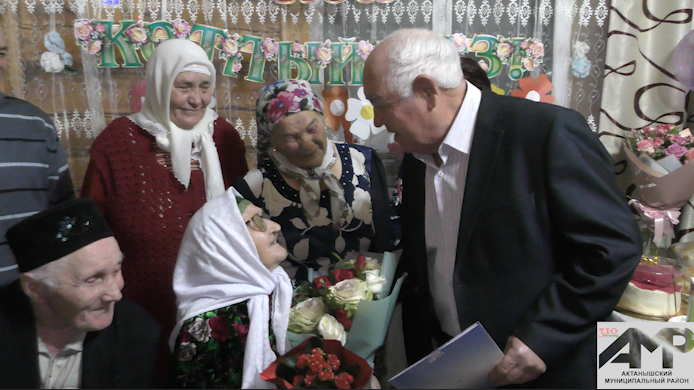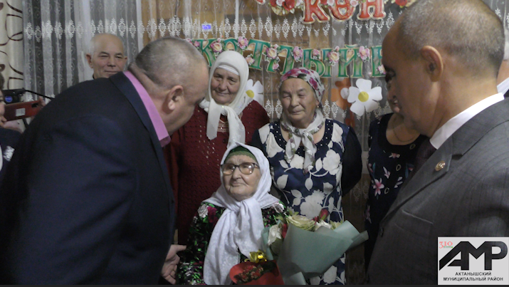 Илсур Фәттахов “Тамыр” хуҗалыгы җитәкчелеге исеменнән Гөлбүләк әбигә чәчәк гөлләмәсе белән җылы юрган, ә җирлекнең ветераннар советы рәисе Рафаэль Зәйнуллин истәлекле бүләк алып килгән иде. Гөлбүләк апа әле дә хәтерле, үткән елларны искә алды ул авылдашларын күргәч.