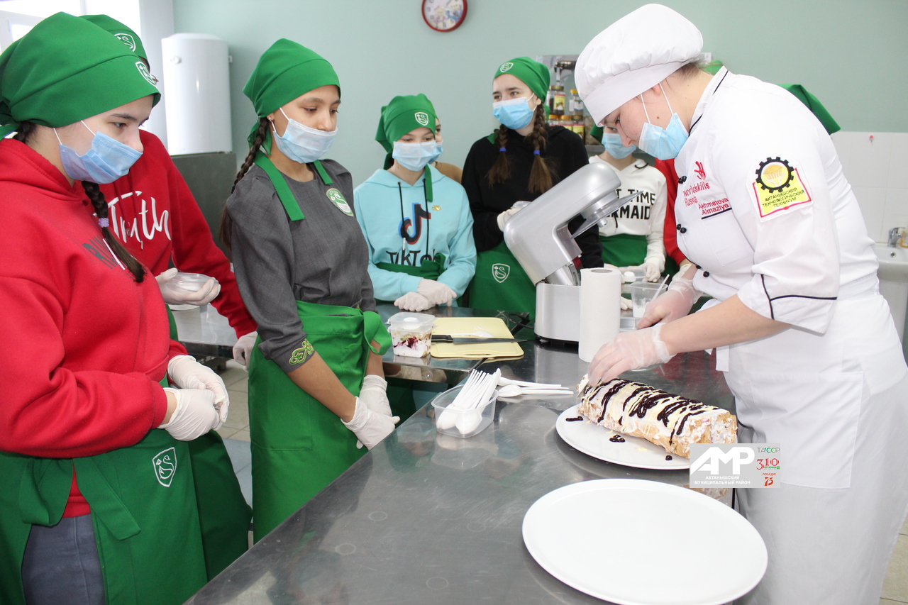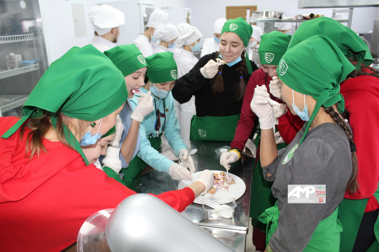 11 укучы икенче катта урнашкан кулинар-кондитер эшләренә өйрәнү цехында аш-су әзерләү буенча тәүге күнекмәләрен алды. Гимназиялеләр үзлектән сыек торт – трайфл әзерләде. Әлеге десерт укучыларның фантазиясен дә күрсәтте, үзләренә тәмле күчтәнәч тә булды.