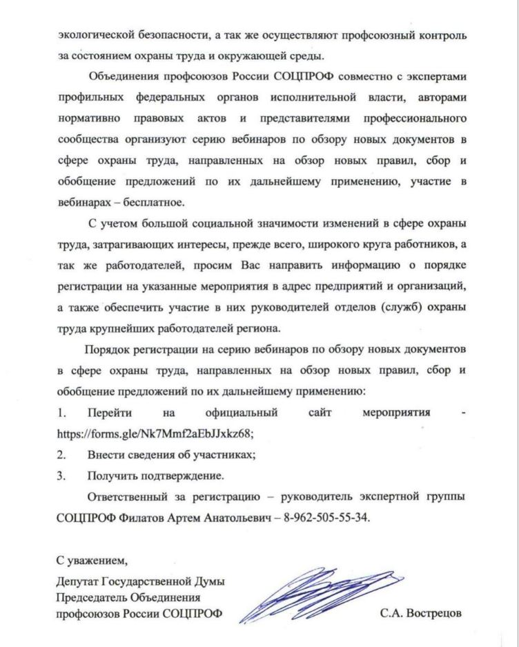 РОССИЯ ПРОФСОЮЗЛАРЫ БЕРЛӘШМӘСЕ (СОЦПРОФ) ХЕЗМӘТНЕ САКЛАУ ӨЛКӘСЕНДӘ ЯҢА ДОКУМЕНТЛАРГА КҮЗӘТҮ БУЕНЧА ВЕБИНАРЛАР СЕРИЯСЕН ОЕШТЫРА.