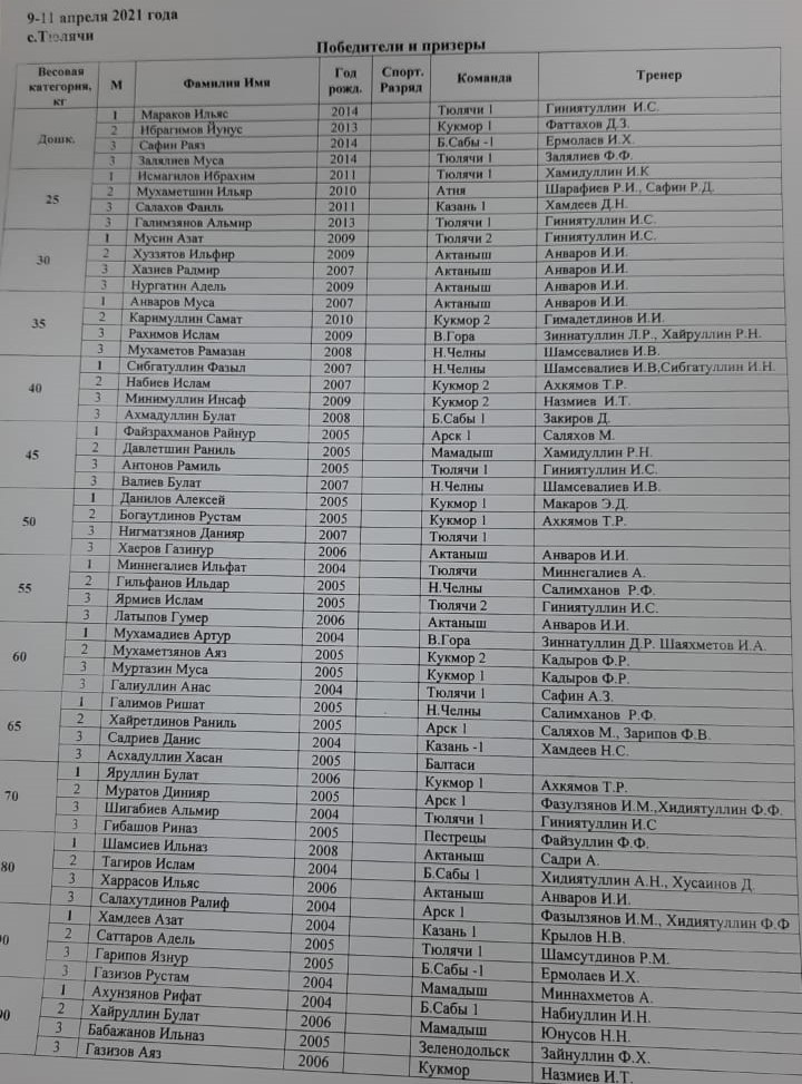 Әлеге турнирда республикабызның барлыгы 19 районыннан 24 команда 257яшь көрәшче катнашты. Командалар беренчелегендә Теләче - беренче, Актаныш - икенче, Кукмара - өченче, Арча дүртенче урыннарны яулады.