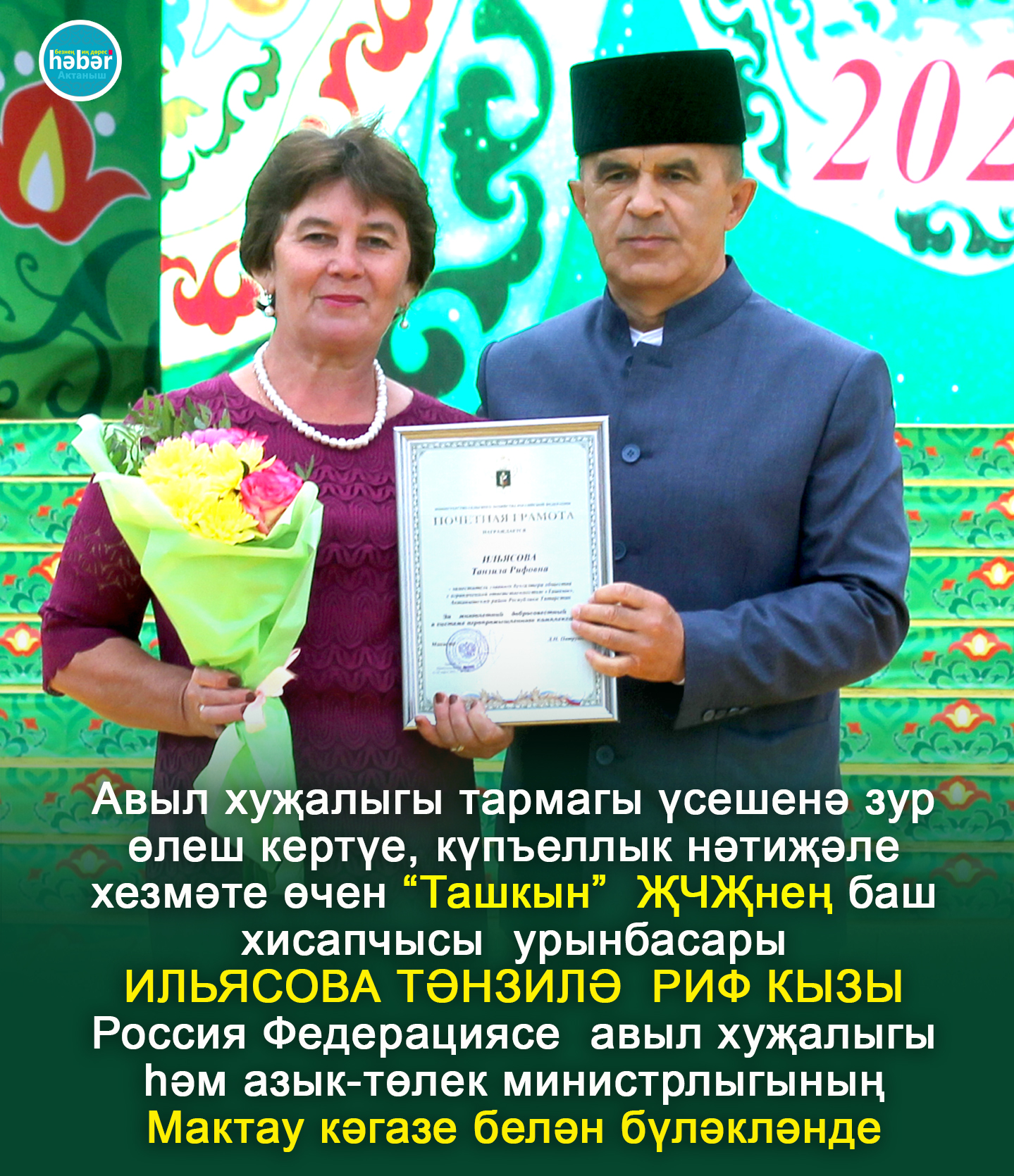Авыл хуҗалыгы тармагы үсешенә зур өлеш кертүе, күпъеллык нәтиҗәле хезмәте өчен “Ташкын” җаваплыгы чикләнгән җәмгыятенең баш хисапчысы урынбасары Ильясова Тәнзилә Риф кызы Россия Федерациясе авыл хуҗалыгы һәм азык-төлек министрлыгының Мактау кәгазе белән бүләкләнде.