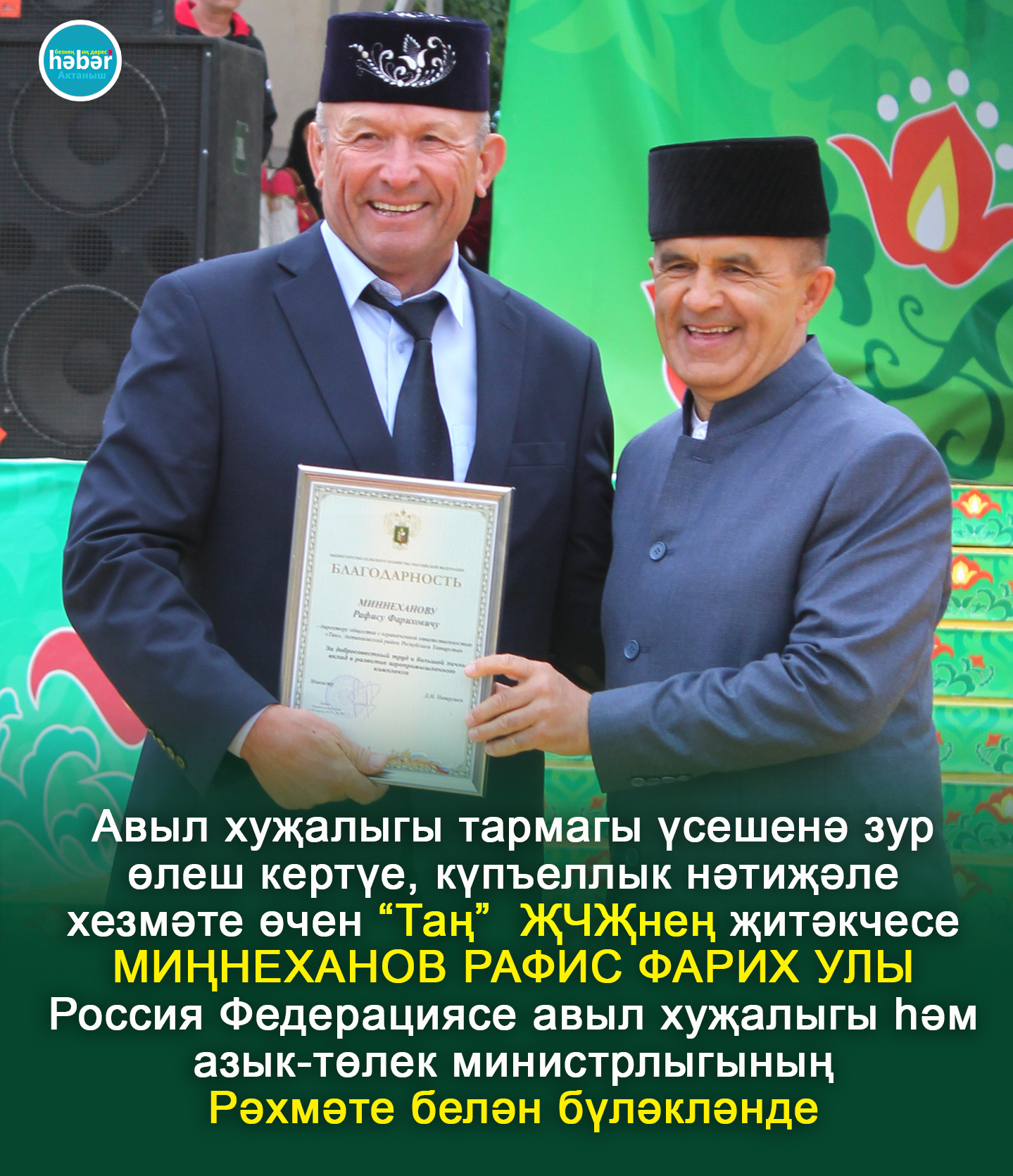 Авыл хуҗалыгы тармагы үсешенә зур өлеш кертүе, күпъеллык нәтиҗәле хезмәте өчен “Таң” җаваплыгы чикләнгән җәмгыяте җитәкчесе Миңнеханов Рафис Фарих улы Россия Федерациясе авыл хуҗалыгы һәм азык-төлек министрлыгының Рәхмәте белән бүләкләнде.