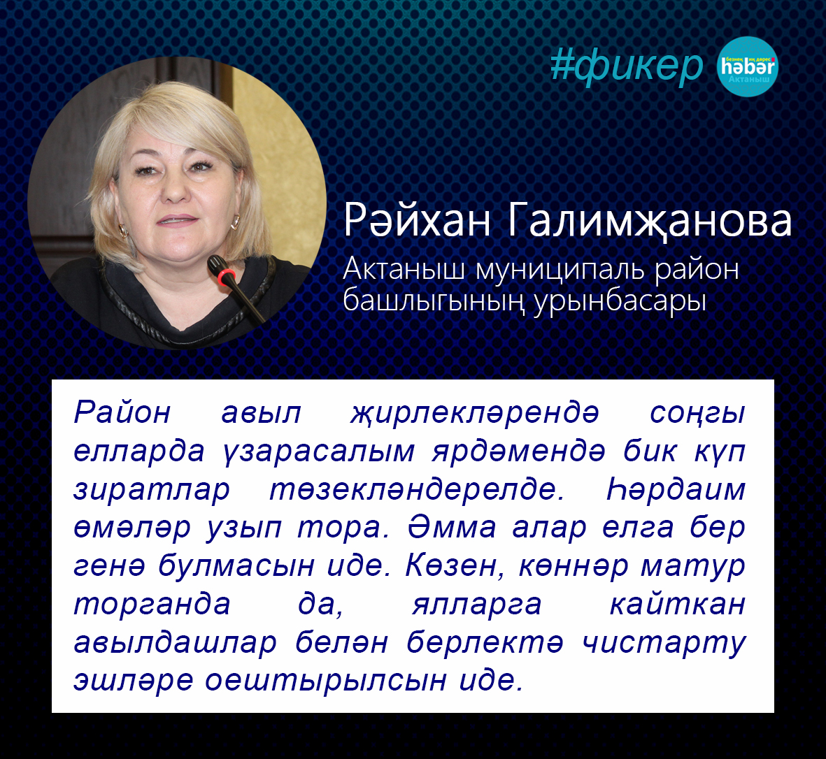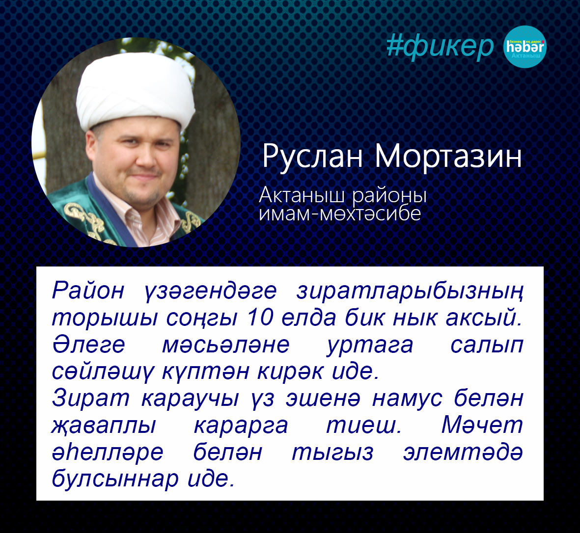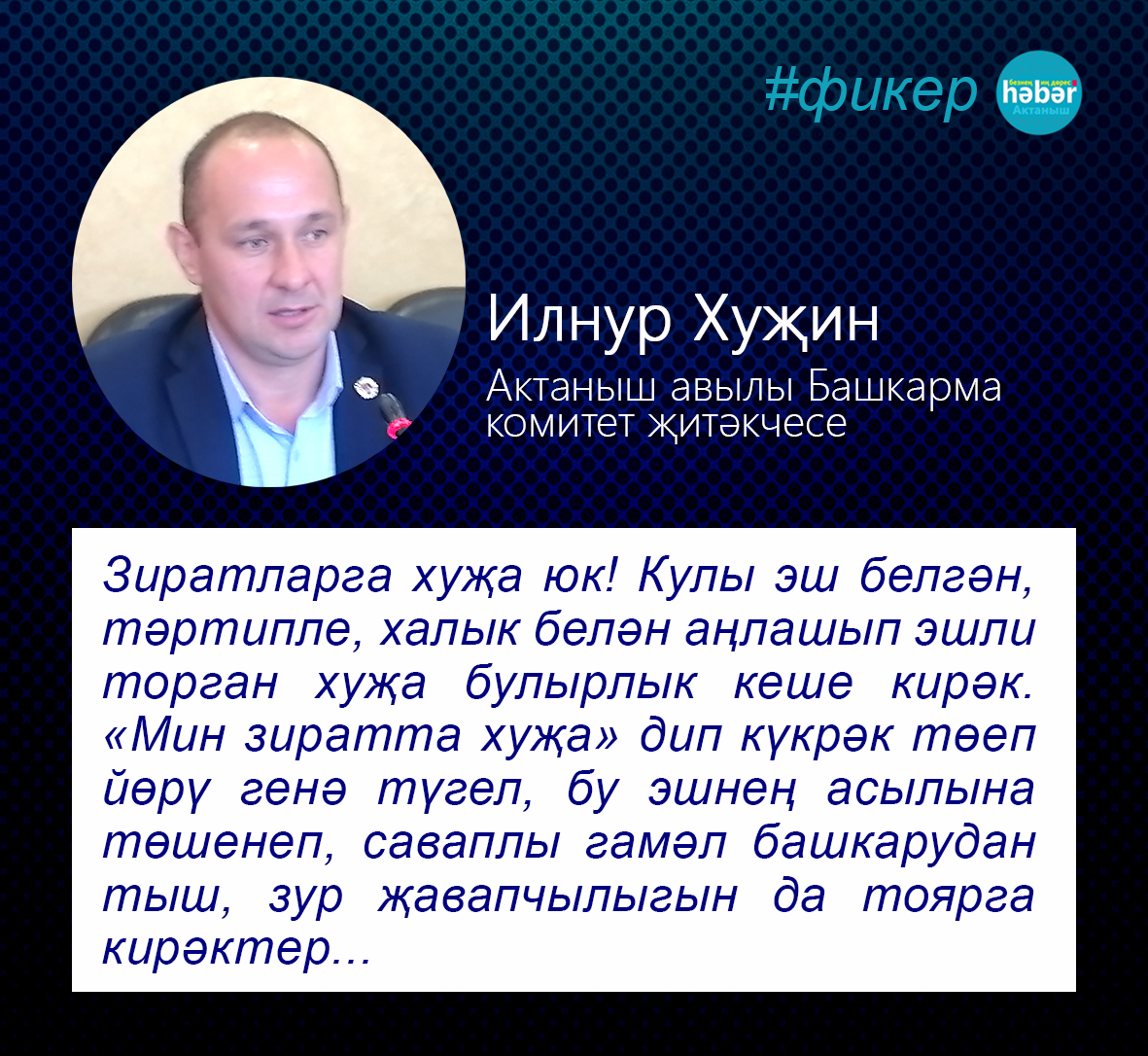 Авылларда азмы-күпме хәрәкәт булса да, район үзәгендәге зиратларның торышы әлегә яхшыны өмет итә. Ел саен оешма-предприятиеләр ярдәме белән зурлап өмәләр узса да, башкарасылар шактый әле. Иң әүвәл тәртип юк. Зиратка ныклы хуҗа кирәк. Әлеге мәсьәлә шушы көннәрдә АКТАНЫШ МУНИЦИПАЛЬ РАЙОНЫ АКТАНЫШ АВЫЛ ЖИРЛЕГЕ СОВЕТЫНЫҢ ДҮРТЕНЧЕ ЧАКЫРЫЛЫШ АЛТЫНЧЫ УТЫРЫШЫнда да зурлап күтәрелде. Бүген исә, хакимияттә район башлыгының урынбасары Рәйхан Галимҗанова, Актаныш авылы Башкарма комитет җитәкчесе Илнур Хуҗин, Актаныш районы имам-мөхтәсибе Руслан хәзрәт Мортазин, Киров авыл җирлеге башлыгы Илназ Магданов һәм Иске Байсар җирлеге башлыгы Рәмис Кадыйров, “Татмедиа” филиалы “Актаныш-информ” корреспондентлары катнашында брифинг узды. Киңәшмәдә яңгыраган фикерләрне сезгә дә тәкъдим итәбез.