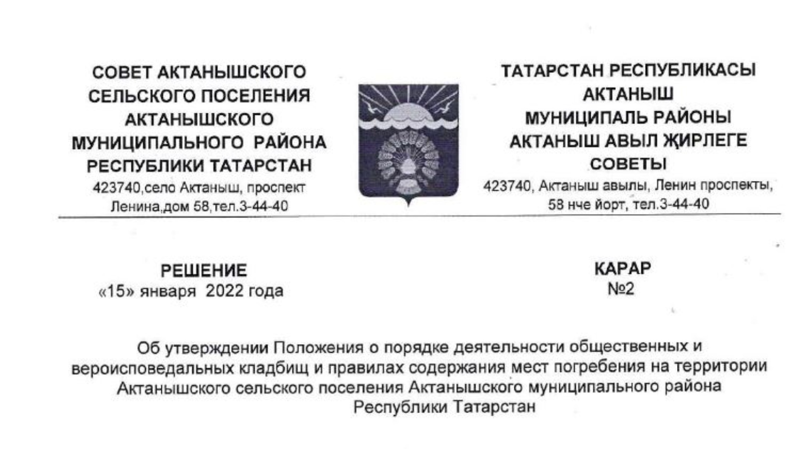 Актаныш муниципаль районы Башкарма комитеты карары белән «Татарстан Республикасы Актаныш муниципаль районы Актаныш авыл җирлеге территориясендә җәмәгать һәм дин тотучы зиратларның эшчәнлеге тәртибе һәм җирләү урыннарын карап тоту кагыйдәләре турында Нигезләмәне раслау турында» гы яңа Нигезләмә, шулай ук «Актаныш муниципаль районында җирләү буенча хезмәтләрнең гарантияләнгән исемлеге нигезендә күрсәтелә торган хезмәтләрнең бәясен раслау турында»гы карар кабул ителде һәм мәгълүматлар "Татарстан Республикасы хокукый мәгълүматының рәсми порталы"нда басылып чыкты. https://pravo.tatarstan.ru/npa_msu/aktanysh/ispolkom.htm