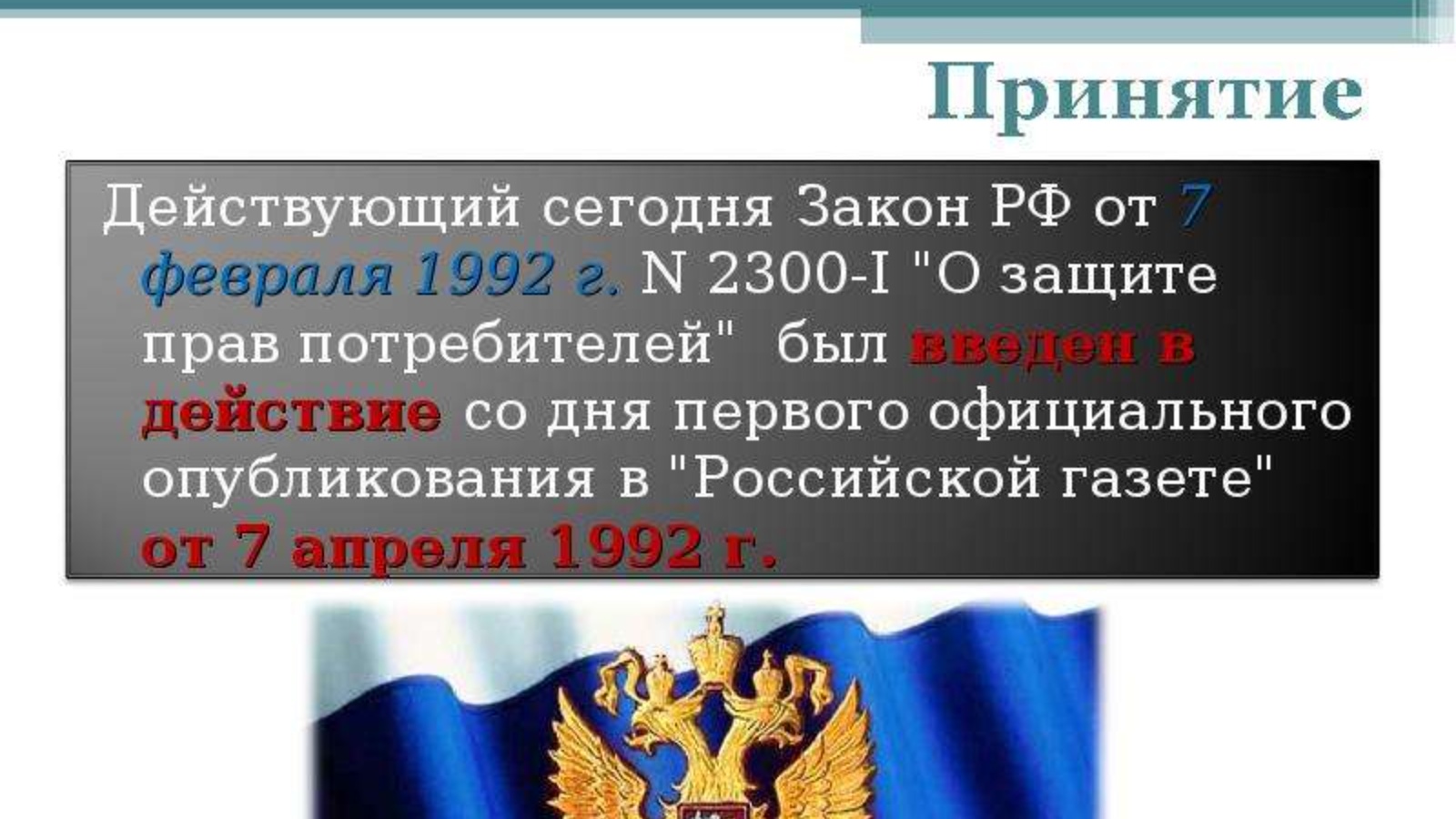 1992 елның 7 февралендә «Кулланучылар хокукларын яклау турында» Россия Федерациясе Законы (алга таба - Закон) гамәлгә керде, бу Россия гражданнарына БМО Генераль Ассамблеясы резолюциясендә беркетелгән хокукларын тормышка ашыру мөмкинлеге бирде.
