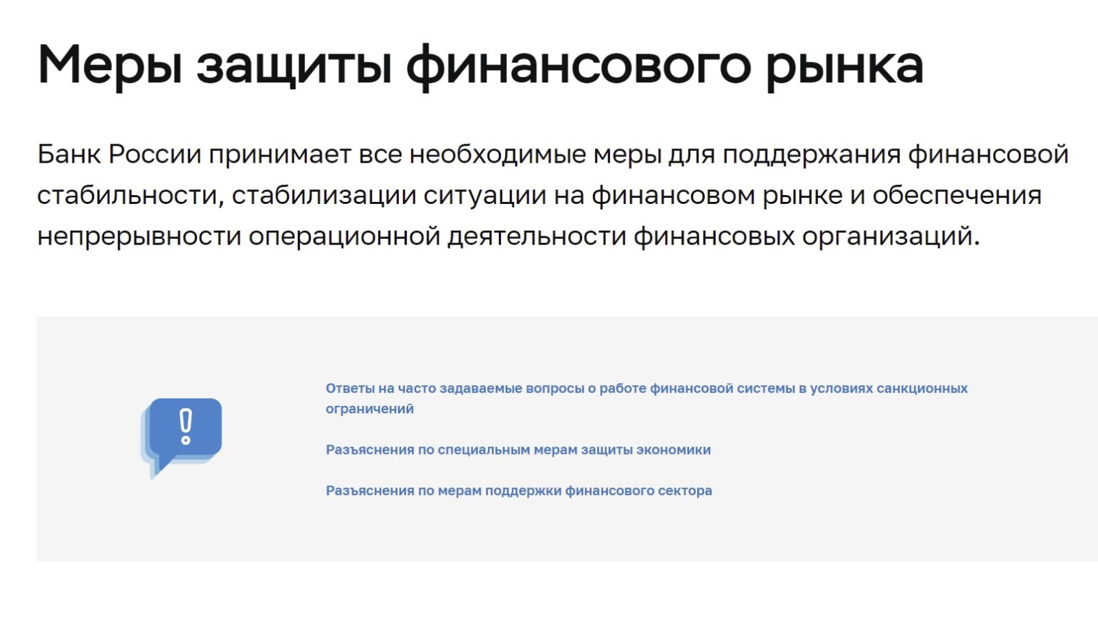 Россия Банкы финанс тотрыклылыгын саклап калу, финанс базарындагы хәлне тотрыкландыру һәм финанс оешмаларының операция эшчәнлегенең өзлексез эшләвен тәэмин итү өчен барлык кирәкле чараларны күрә.