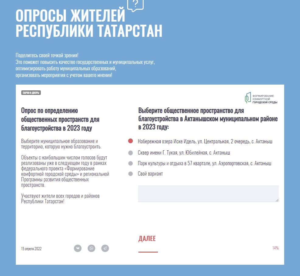 Татарстанда 15 апрельдән 30 майга кадәр 2023 елга республиканың җәмәгать киңлекләрен һәм ишегалларын төзекләндерү объектлары өчен онлайн-тавыш бирү башланды. Актанышның матурлануына һәм якын киләчәктәге үзгәрешләренә сез дә өлеш кертә аласыз. Тавышны https://open.tatarstan.ru/polls/ аша кереп бирергә була..jpg)