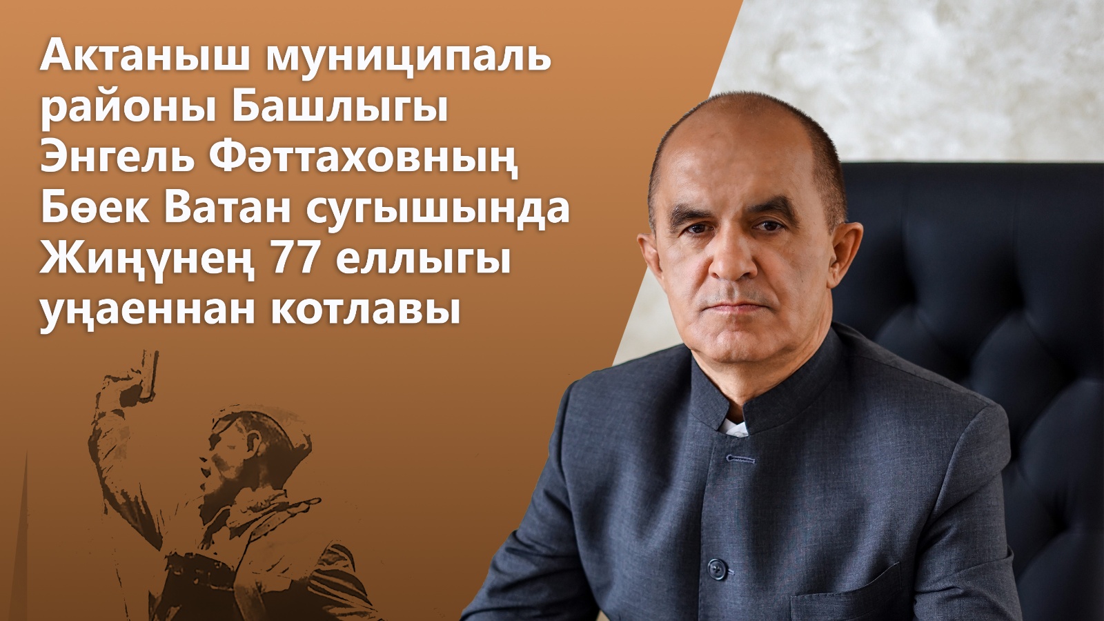 Шушы унайдан Актаныш муниципаль район Советы, Башкарма комитеты һәм шәхсән үз исемемнән сезне ихлас күңелдән бу олуг бәйрәм белән тәбрик итәм, сезгә ныклы сәламәтлек, исән-имин булып, күңел тынычлыгы белән озак гомер итүегезне телим.