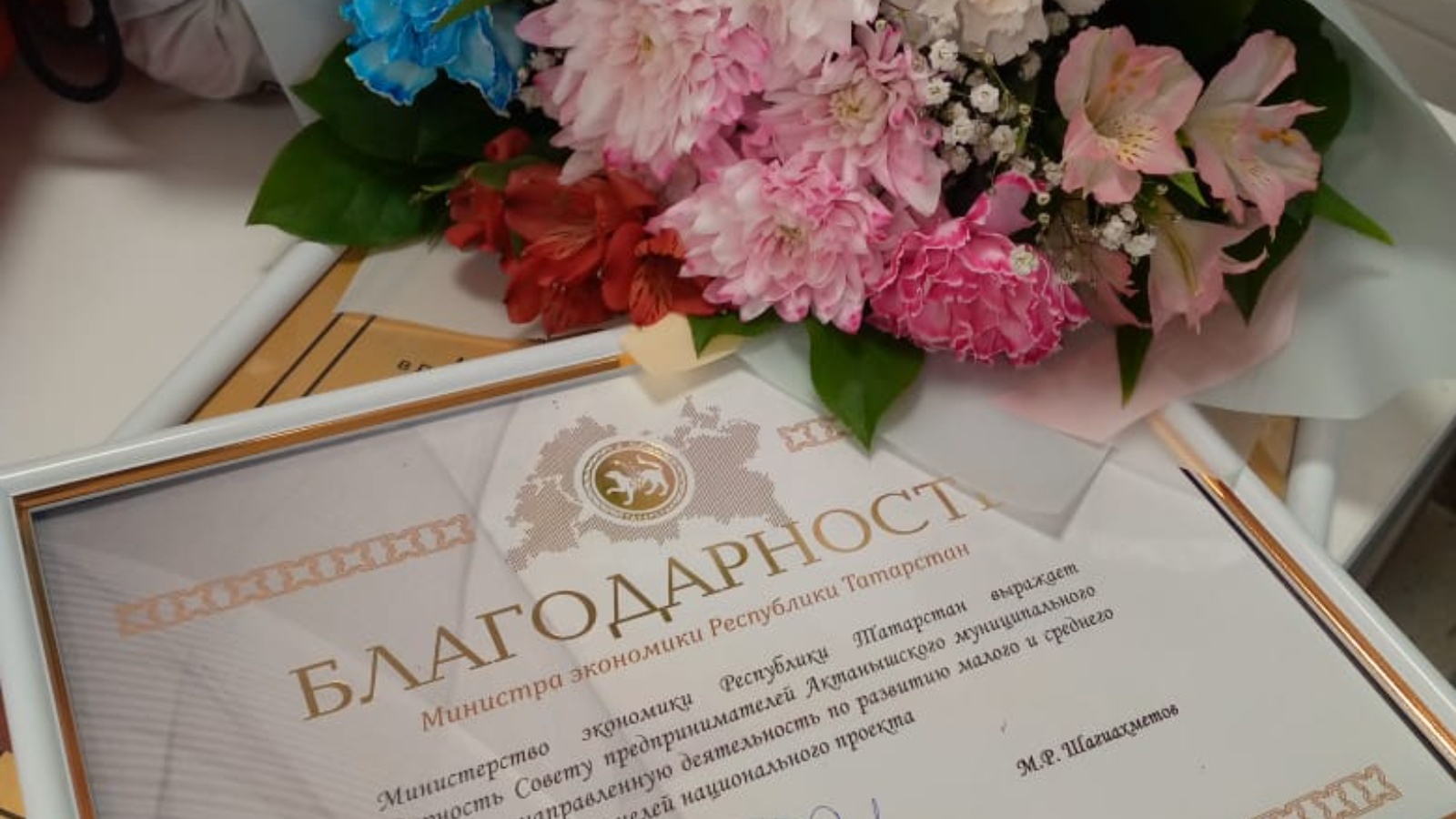 Актаныш районы эшкуарлары Советы кече һәм урта эшкуарлыкны үстерүгә керткән өлеше өчен Татарстан Республикасы Икътисад министрлыгының Рәхмәт хаты белән бүләкләнде.