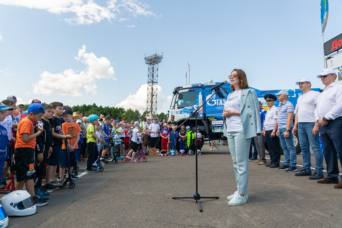 «Бүген Яр Чаллыда-чын автоспорт бәйрәме! Биредә һәрвакыт спорт һәм сәламәт яшәү рәвеше, үзара ярдәмләшү һәм дуслык атмосферасы хөкем сөрә. Безнең балалар биредә өлкән иптәшләр, пилотлар, штурманнар, легендар «КАМАЗ-мастер» командасы механиклары мисалында батырлык һәм җаваплылык дәресе алалар, техника белән эшләргә өйрәнәләр, машина йөртү теориясен һәм практикасын үзләштерәләр. Бары алга, спорт үрләренә!» – дип сәламләде Әлфия Когогина чарада катнашучыларны һәм тамашачыларны.(1).jpeg)