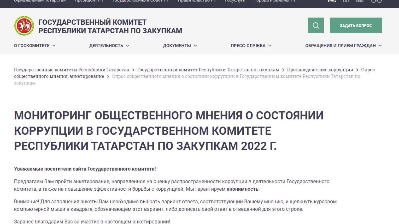 Татарстан Республикасының Сатып алулар буенча дәүләт комитеты сайтының «Коррупциягә каршы көрәш» бүлегендә «җәмәгатьчелек фикерен сораштыру, анкеталаштыру» өстәмә битендә коррупциянең дәүләт комитеты эшчәнлегендә таралуын бәяләүгә, шулай ук коррупциягә каршы көрәшнең нәтиҗәлелеген арттыруга юнәлдерелгән анкеталаштыру үткәрелә (http://goszakupki.tatarstan.ru/rus/opros-obshchestvennogo-mneniya-anketirovanie.htm)