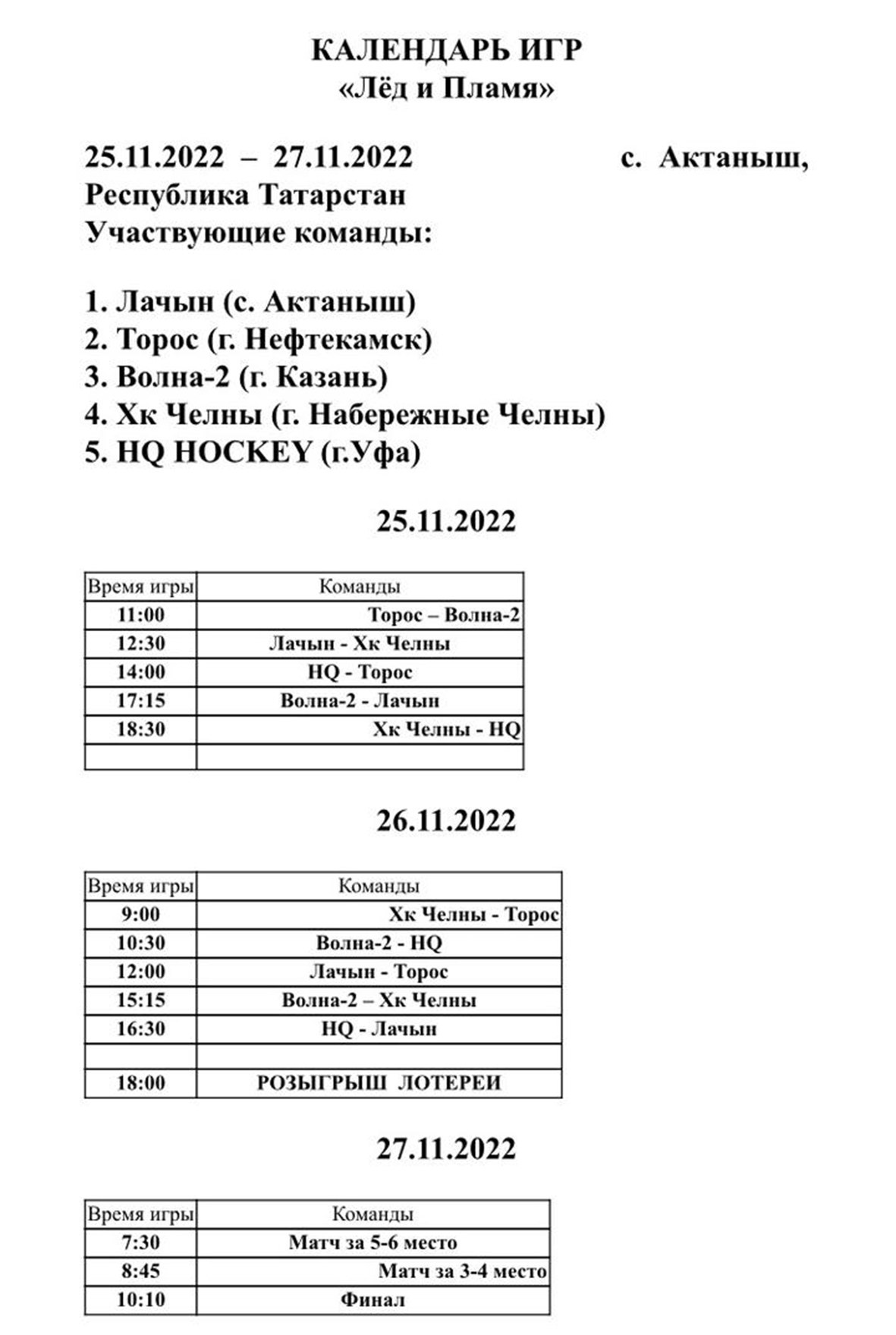 25 ноябрьдән 27 ноябрьгә кадәр "Лачын" боз сараенда "Боз һәм ялкын" дип исемләнгән хоккей турниры узачак! Биредә Актаныш, Казан, Яр Чаллы, Нефтекамск һәм Уфа командалары очрашачак!